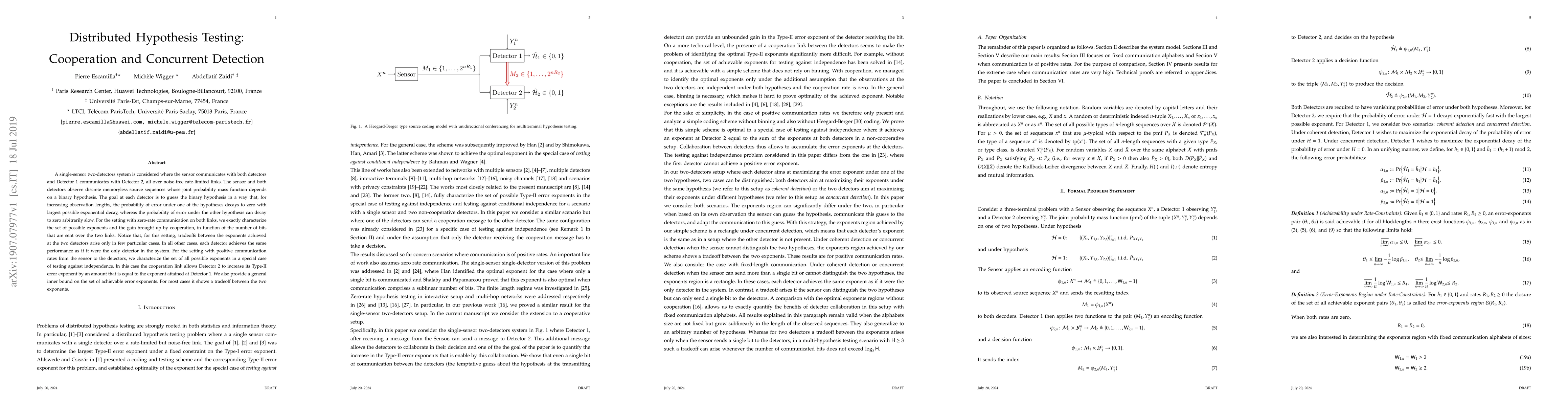 This paper investigates distributed hypothesis testing in a system with a sensor and two detectors, focusing on the benefits of cooperation through communication. It characterizes the error exponents for both zero-rate and positive communication rates, showing that cooperation can significantly enhance detection performance, especially when communication links are rate-limited.