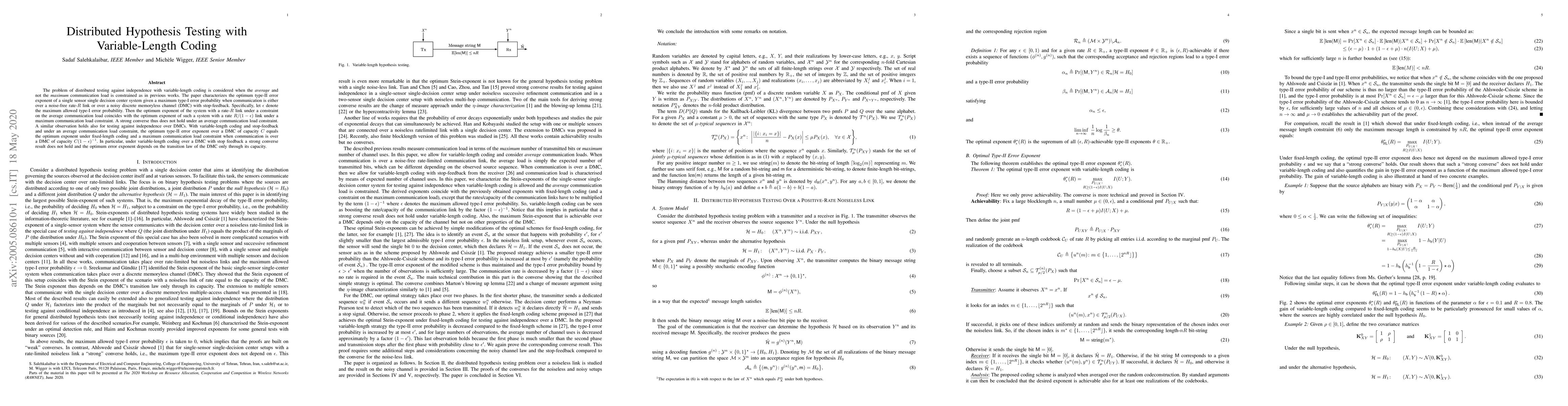The problem of distributed testing against independence with variable-length coding is considered when the \emph{average} and not the \emph{maximum} communication load is constrained as in previous works. The paper characterizes the optimum type-II error exponent of a single sensor single decision center system given a maximum type-I error probability when communication is either over a noise-free rate-$R$ link or over a noisy discrete memoryless channel (DMC) with stop-feedback. Specifically, let $\epsilon$ denote the maximum allowed type-I error probability. Then the optimum exponent of the system with a rate-$R$ link under a constraint on the average communication load coincides with the optimum exponent of such a system with a rate $R/(1-\epsilon)$ link under a maximum communication load constraint. A strong converse thus does not hold under an average communication load constraint. A similar observation holds also for testing against independence over DMCs. With variable-length coding and stop-feedback and under an average communication load constraint, the optimum type-II error exponent over a DMC of capacity $C$ equals the optimum exponent under fixed-length coding and a maximum communication load constraint when communication is over a DMC of capacity $C(1-\epsilon)^{-1}$. In particular, under variable-length coding over a DMC with stop feedback a strong converse result does not hold and the optimum error exponent depends on the transition law of the DMC only through its capacity.