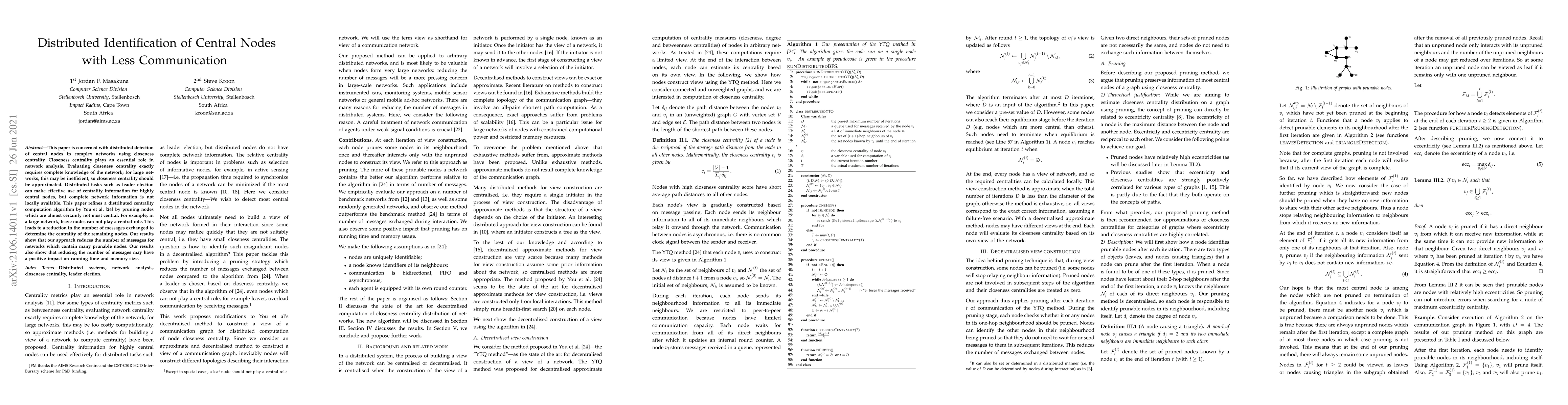 This paper is concerned with distributed detection of central nodes in complex networks using closeness centrality. Closeness centrality plays an essential role in network analysis. Evaluating closeness centrality exactly requires complete knowledge of the network; for large networks, this may be inefficient, so closeness centrality should be approximated. Distributed tasks such as leader election can make effective use of centrality information for highly central nodes, but complete network information is not locally available. This paper refines a distributed centrality computation algorithm by You et al. [24] by pruning nodes which are almost certainly not most central. For example, in a large network, leave nodes can not play a central role. This leads to a reduction in the number of messages exchanged to determine the centrality of the remaining nodes. Our results show that our approach reduces the number of messages for networks which contain many prunable nodes. Our results also show that reducing the number of messages may