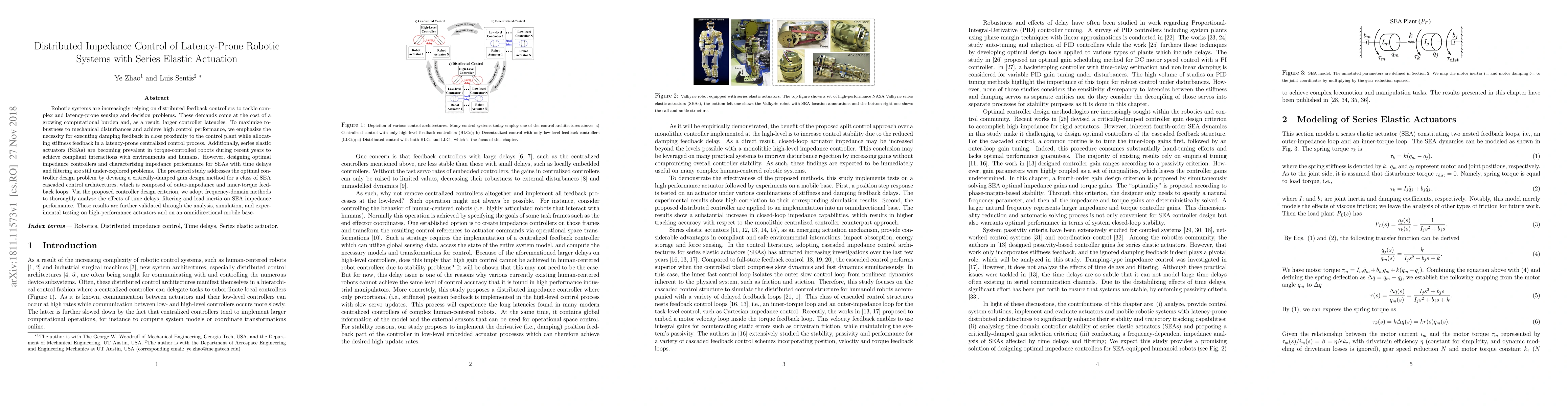 This paper proposes a critically-damped gain design method for distributed impedance control in latency-prone robotic systems with series elastic actuators (SEAs). It analyzes the effects of time delays, filtering, and load inertia on SEA impedance performance using frequency-domain methods, validated through simulation and experiments.