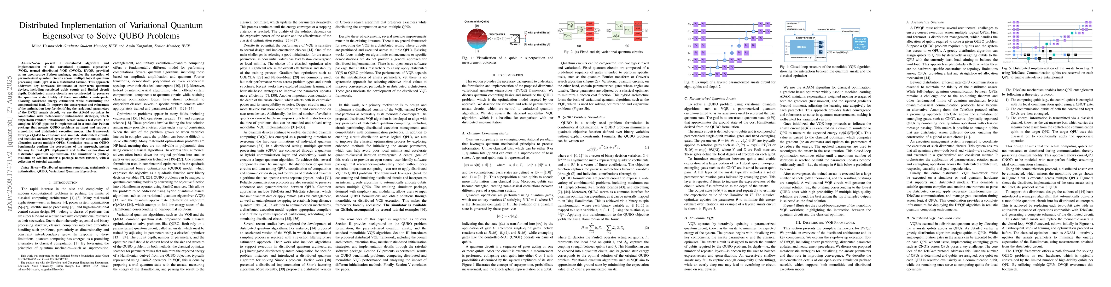 We present a distributed algorithm and implementation of the variational quantum eigensolver (VQE), termed distributed VQE (DVQE). DVQE, provided as an open-source Python package, enables the execution of parameterized quantum circuits across multiple logical quantum processing units (QPUs) in a distributed fashion. This approach addresses key hardware limitations of near-term quantum devices, including restricted qubit counts and limited circuit depth. Distributed ansatz circuits are constructed to preserve the quantum state fidelity of their monolithic counterparts, allowing consistent energy estimation while distributing the computational load. To improve the convergence and robustness of the optimization loop for identifying the variational parameters of the DVQE ansatz circuit, we use the ADAM optimizer in combination with metaheuristic initialization strategies, which outperform random initialization across various test cases. The complete DVQE pipeline is implemented in a modular Python package that accepts QUBO problems as input and supports monolithic and distributed execution modes. The framework leverages Qiskit to construct and simulate distributed circuits, and includes an internal greedy algorithm for automatic qubit allocation across multiple QPUs. Simulation results on QUBO benchmarks confirm the correctness of the approach, paving the way for real QPU deployment and further exploration of distributed quantum optimization. \textbf{The simulator is publicly available on \href{https://github.com/LSU-RAISE-LAB/DVQE.git}{GitHub} under a package named raiselab, with a collection of tutorial examples.}