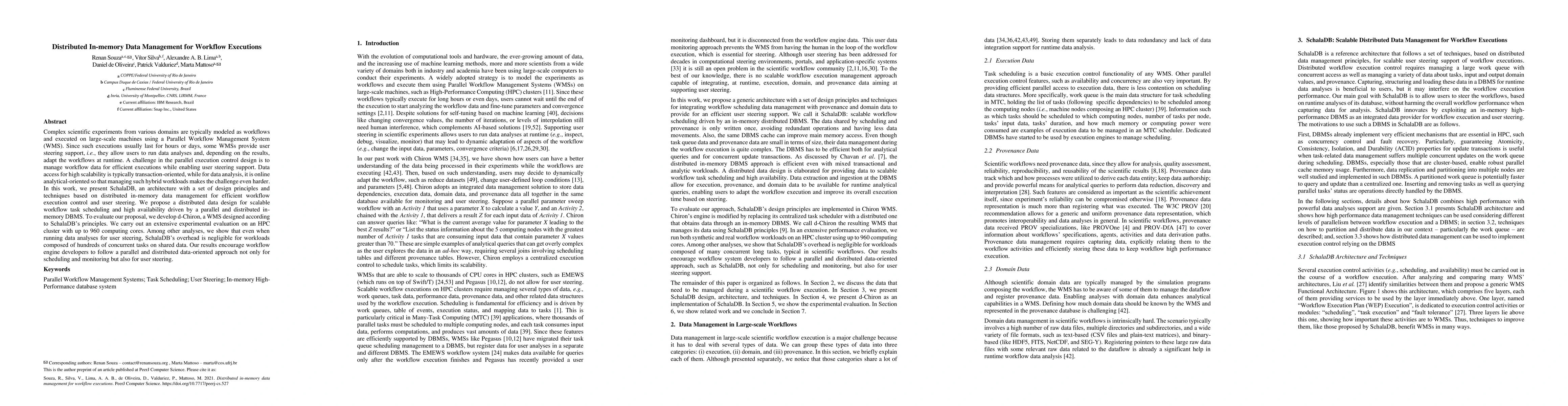 SchalaDB presents an architecture for distributed in-memory data management to enhance the control and execution of workflow executions, facilitating efficient runtime data analysis and adaptation. The proposed d-Chiron WMS demonstrates negligible overhead in managing hundreds of concurrent tasks, encouraging a parallel and distributed data-oriented approach for workflow management.