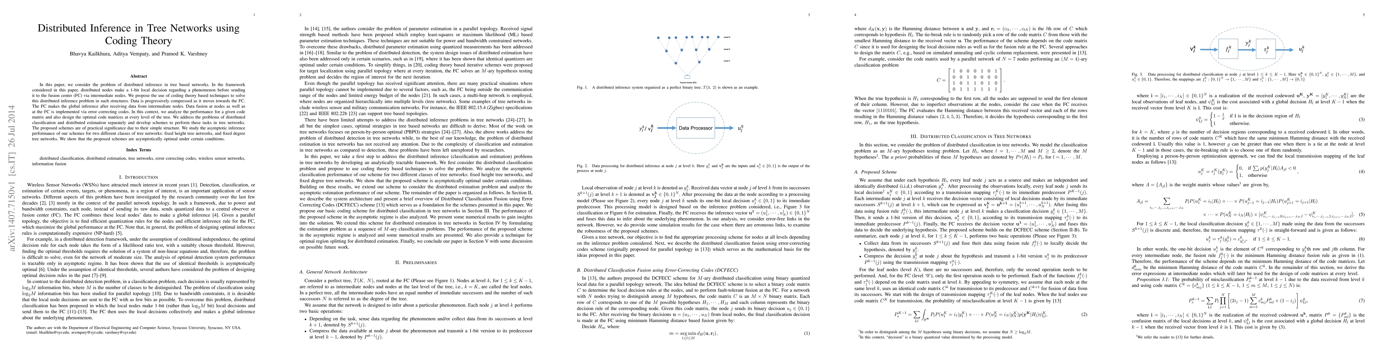 This paper explores distributed inference in tree networks using coding theory, proposing techniques for nodes to make local 1-bit decisions and progressively compress data towards a fusion center. It designs optimal code matrices and analyzes performance, showing asymptotic optimality for fixed height and degree tree networks.