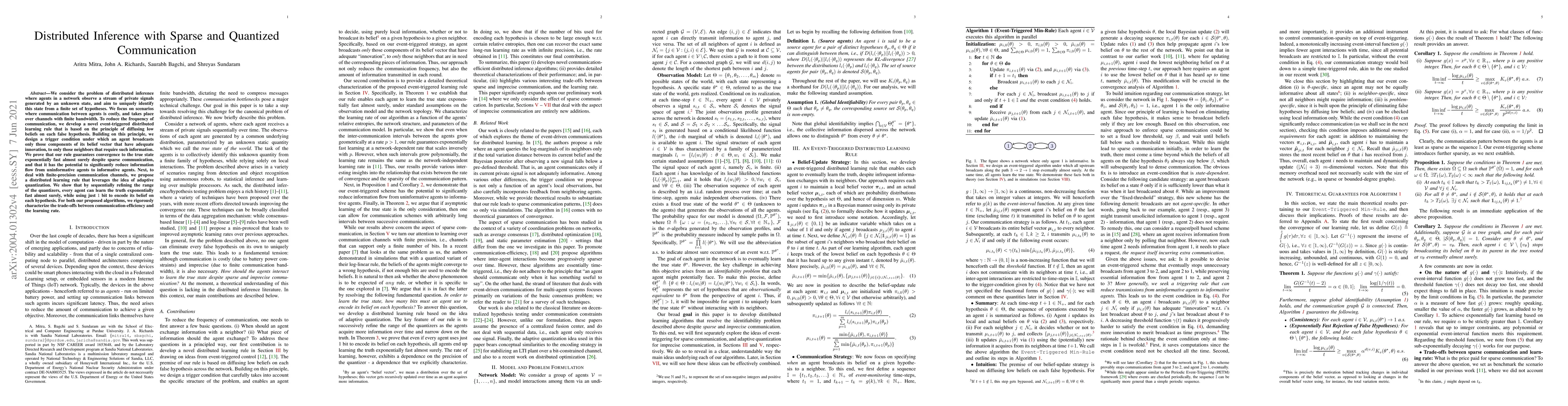 We consider the problem of distributed inference where agents in a network observe a stream of private signals generated by an unknown state, and aim to uniquely identify this state from a finite set of hypotheses. We focus on scenarios where communication between agents is costly, and takes place over channels with finite bandwidth. To reduce the frequency of communication, we develop a novel event-triggered distributed learning rule that is based on the principle of diffusing low beliefs on each false hypothesis. Building on this principle, we design a trigger condition under which an agent broadcasts only those components of its belief vector that have adequate innovation, to only those neighbors that require such information. We prove that our rule guarantees convergence to the true state exponentially fast almost surely despite sparse communication, and that it has the potential to significantly reduce information flow from uninformative agents to informative agents. Next, to deal with finite-precision communication channels, we propose a distributed learning rule that leverages the idea of adaptive quantization. We show that by sequentially refining the range of the quantizers, every agent can learn the truth exponentially fast almost surely, while using just $1$ bit to encode its belief on each hypothesis. For both our proposed algorithms, we rigorously characterize the trade-offs between communication-efficiency and the learning rate.