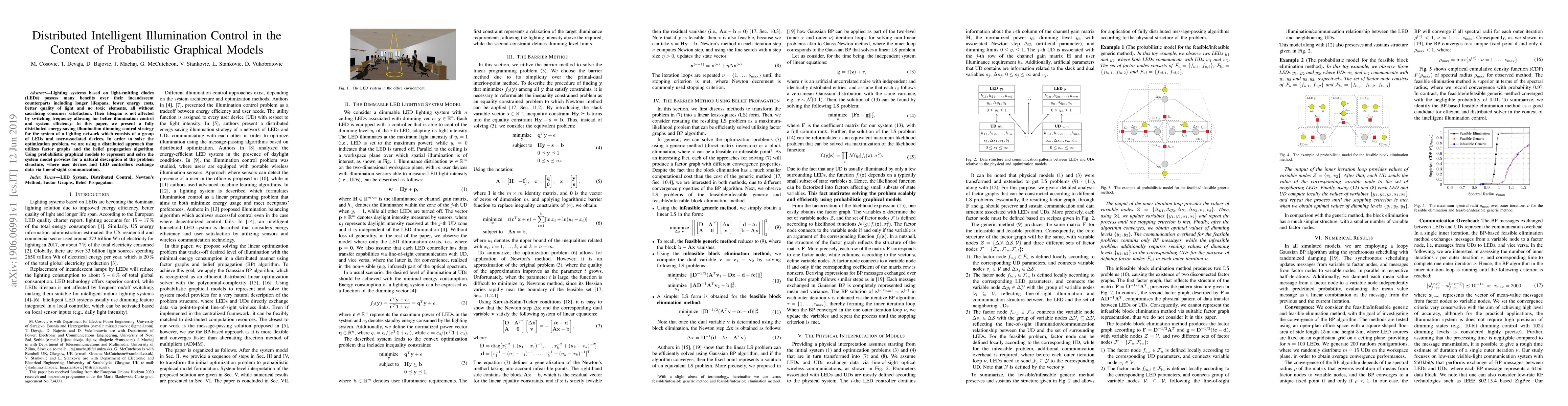 This paper proposes a distributed intelligent dimming control strategy for LED lighting networks using probabilistic graphical models and belief propagation. The approach aims to optimize energy efficiency while maintaining user satisfaction through a decentralized system where LED controllers and user devices communicate via line-of-sight.