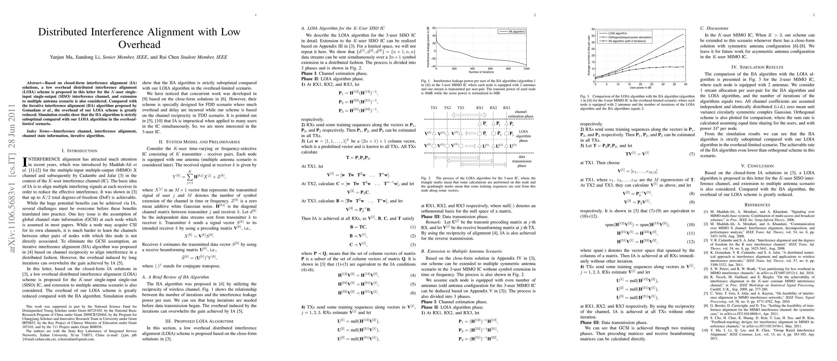 Based on closed-form interference alignment (IA) solutions, a low overhead distributed interference alignment (LOIA) scheme is proposed in this paper for the $K$-user SISO interference channel, and extension to multiple antenna scenario is also considered. Compared with the iterative interference alignment (IIA) algorithm proposed by Gomadam et al., the overhead is greatly reduced. Simulation results show that the IIA algorithm is strictly suboptimal compared with our LOIA algorithm in the overhead-limited scenario.