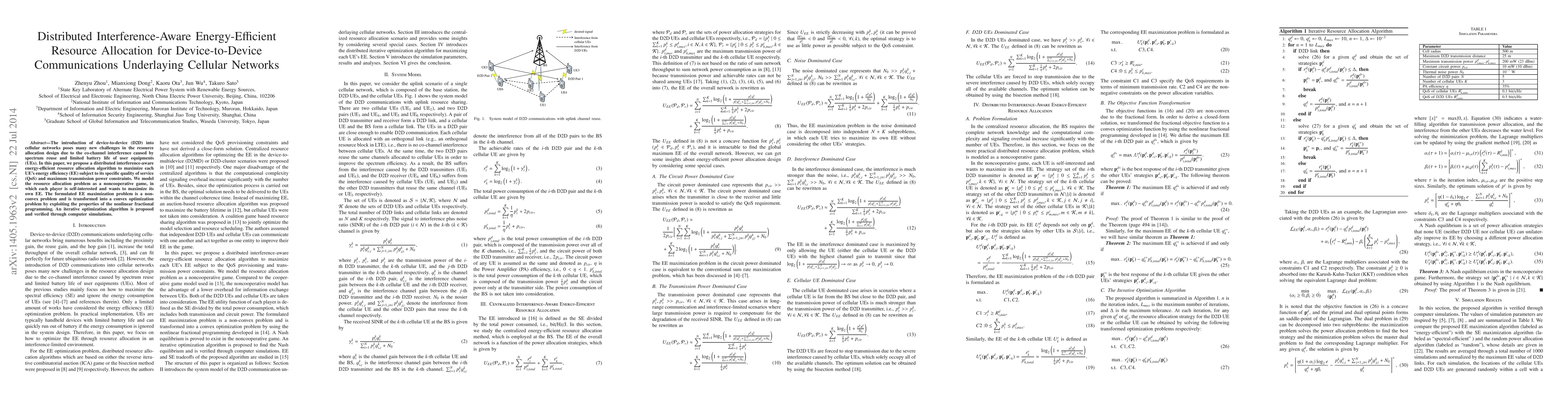 This paper proposes a distributed algorithm for energy-efficient resource allocation in D2D communications under cellular networks, aiming to maximize each user's energy efficiency while managing interference and respecting QoS and power constraints. The problem is modeled as a noncooperative game and solved using convex optimization techniques.