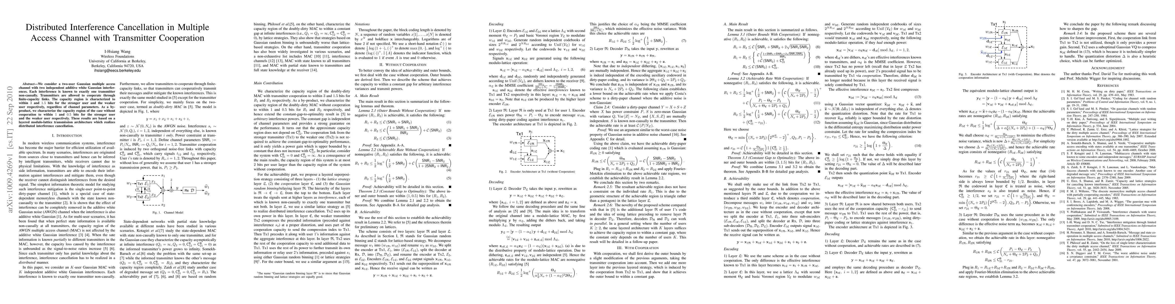 This paper characterizes the capacity region for a two-user Gaussian multiple access channel with cooperative transmitters managing independent additive white Gaussian interferences, achieving bounds of 3 and 1.5 bits for stronger and weaker users respectively. The study also provides bounds for non-cooperative scenarios, using a layered modulo-lattice transmission architecture for distributed interference cancellation.