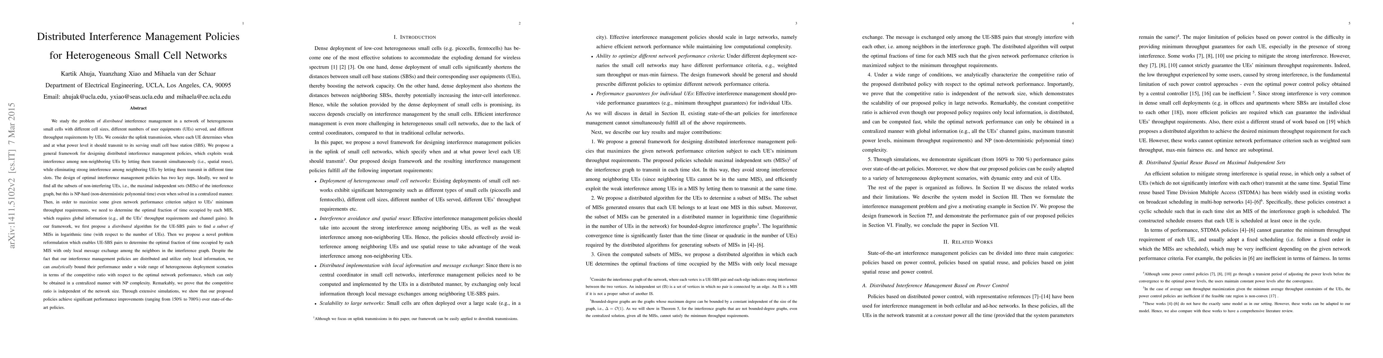 This paper proposes distributed algorithms for managing interference in large-scale small cell networks, focusing on maximizing network performance while meeting minimum QoS requirements. The algorithms identify optimal transmission strategies for user-equipment to base station pairs, achieving significant performance improvements over existing methods.