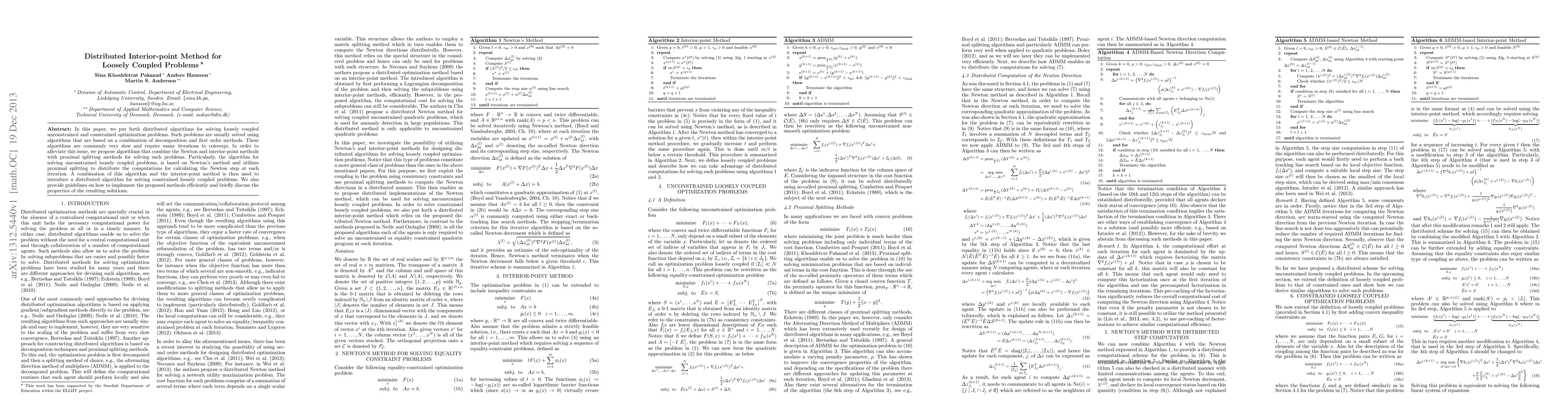 The paper proposes distributed algorithms for solving loosely coupled unconstrained and constrained optimization problems, combining Newton and interior-point methods with proximal splitting methods for distributed computation of Newton steps.