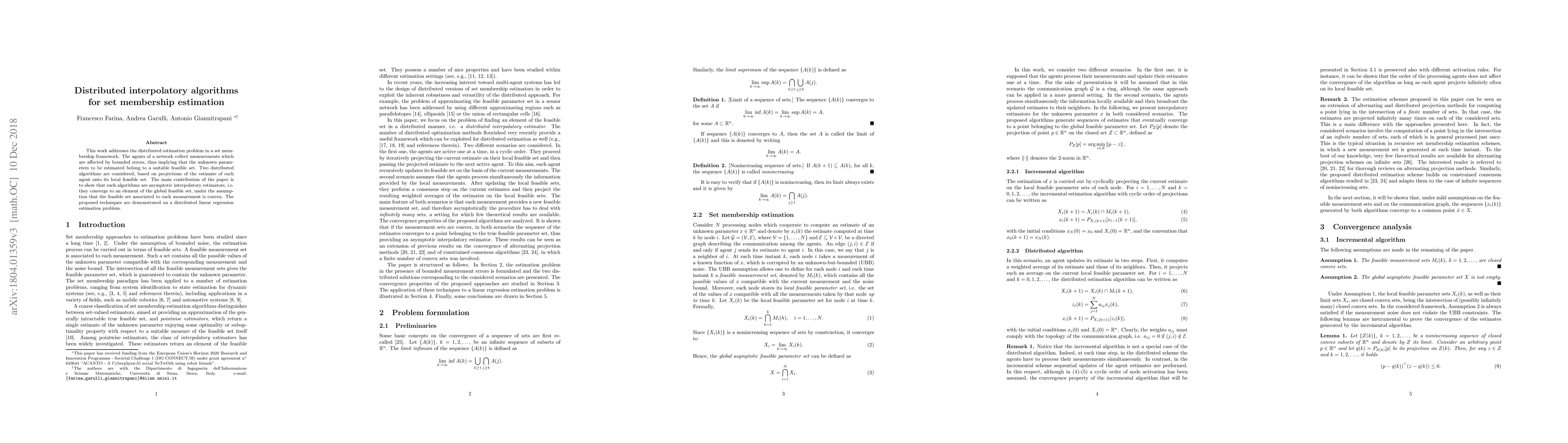 This work addresses the distributed estimation problem in a set membership framework. The agents of a network collect measurements which are affected by bounded errors, thus implying that the unknown parameters to be estimated belong to a suitable feasible set. Two distributed algorithms are considered, based on projections of the estimate of each agent onto its local feasible set. The main contribution of the paper is to show that such algorithms are asymptotic interpolatory estimators, i.e. they converge to an element of the global feasible set, under the assumption that the feasible set associated to each measurement is convex. The proposed techniques are demonstrated on a distributed linear regression estimation problem.