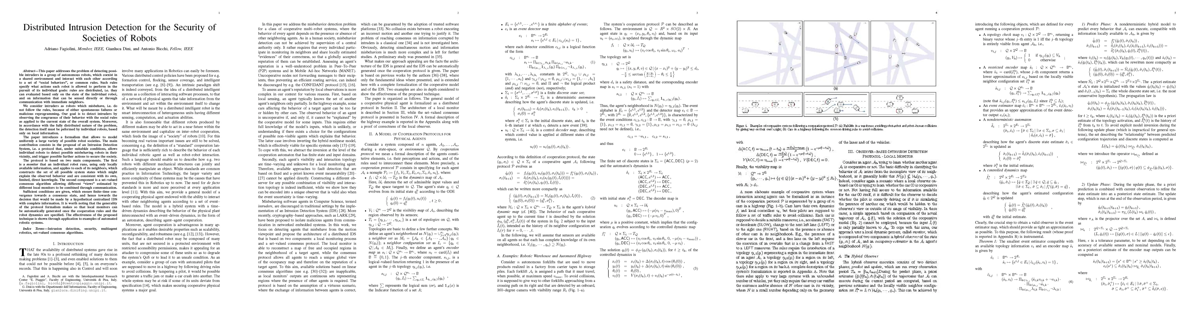 This paper addresses the problem of detecting possible intruders in a group of autonomous robots, which coexist in a shared environment and interact with each other according to a set of "social behaviors", or common rules. Such rules specify what actions each robot is allowed to perform in the pursuit of its individual goals: rules are distributed, i.e. they can evaluated based only on the state of the individual robot, and on information that can be sensed directly or through communication with immediate neighbors. We consider intruders as robots which misbehave, i.e. do not follow the rules, because of either spontaneous failures or malicious reprogramming. Our goal is to detect intruders by observing the congruence of their behavior with the social rules as applied to the current state of the overall system. Moreover, in accordance with the fully distributed nature of the problem, the detection itself must be peformed by individual robots, based only on local information. The paper introduces a formalism that allows to model uniformly a large variety of possible robot societies. The main contribution consists in the proposal of an Intrusion Detection System, i.e. a protocol that, under suitabkle conditions, allows individual robots to detect possible misbehaving robots in their vicinity, and trigger possible further actions to secure the society. It is worth noting that the generality of the protocol formalism makes so that local monitors can be automatically generated once the cooperation rules and the robot dynamics are specified. The effectiveness of the proposed technique is shown through application to examples of automated robotic systems.