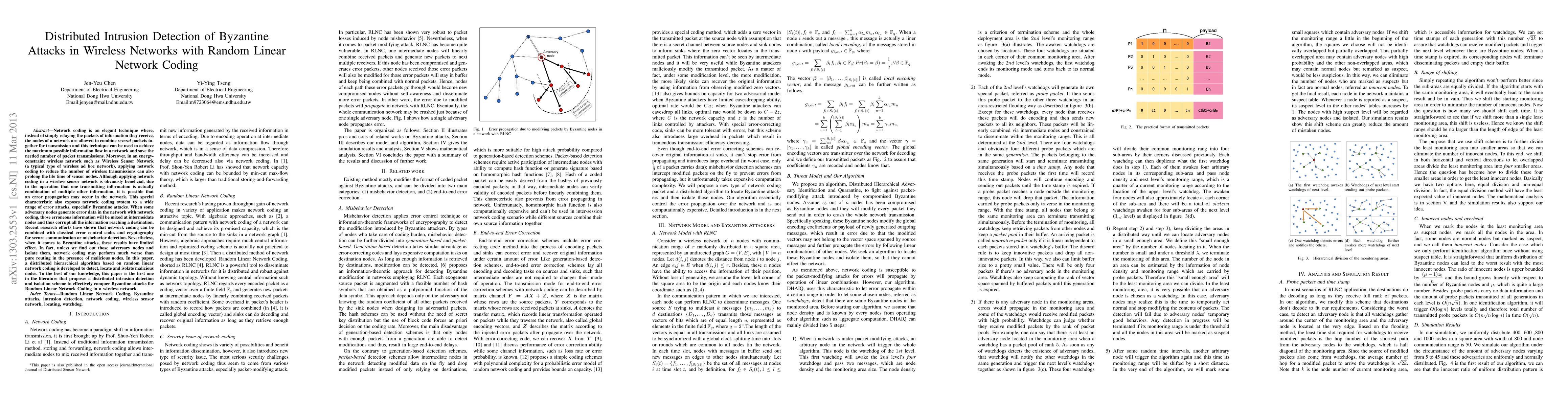 This paper proposes a distributed hierarchical algorithm based on random linear network coding to detect, locate, and isolate Byzantine attacks in wireless sensor networks. The method aims to mitigate the adverse effects of error propagation and malicious nodes, enhancing the security and efficiency of network communication.