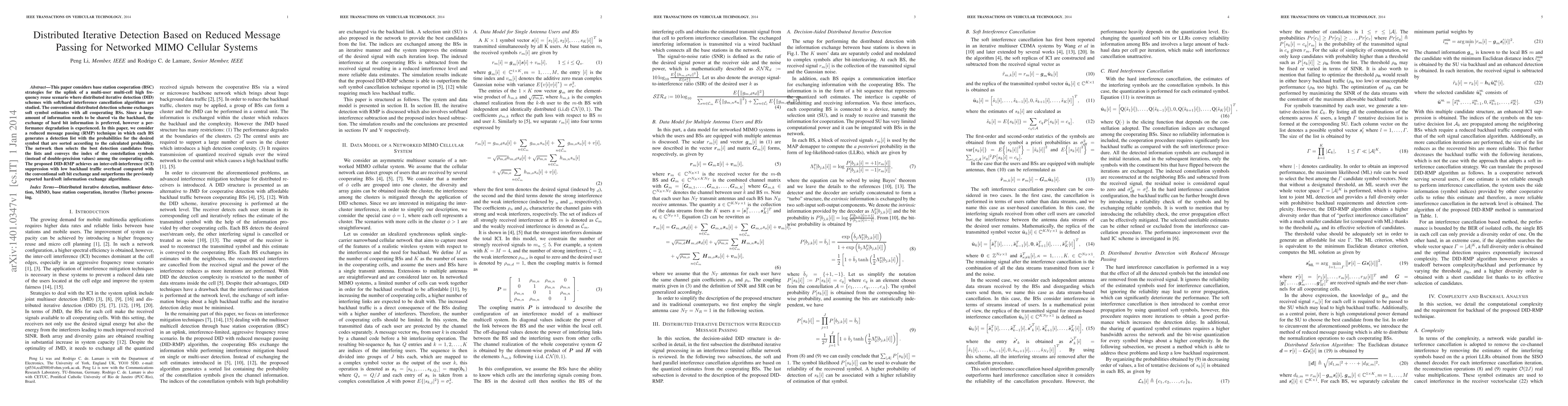 A new method called Distributed Iterative Detection Based on Reduced Message Passing improves network performance for multi-user cellular systems by reducing backhaul traffic while maintaining ICI suppression. It outperforms existing methods with lower overhead.