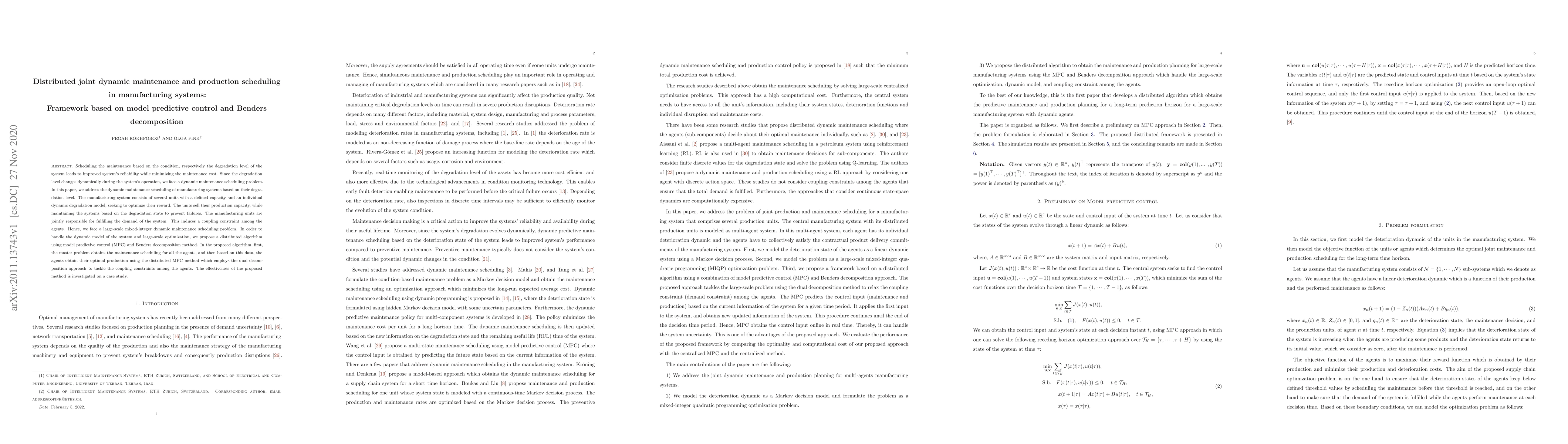This paper proposes a distributed framework combining model predictive control (MPC) and Benders decomposition for dynamic maintenance scheduling in manufacturing systems. The approach optimizes maintenance based on degradation levels to enhance reliability while minimizing costs, addressing large-scale mixed-integer optimization through a distributed algorithm.