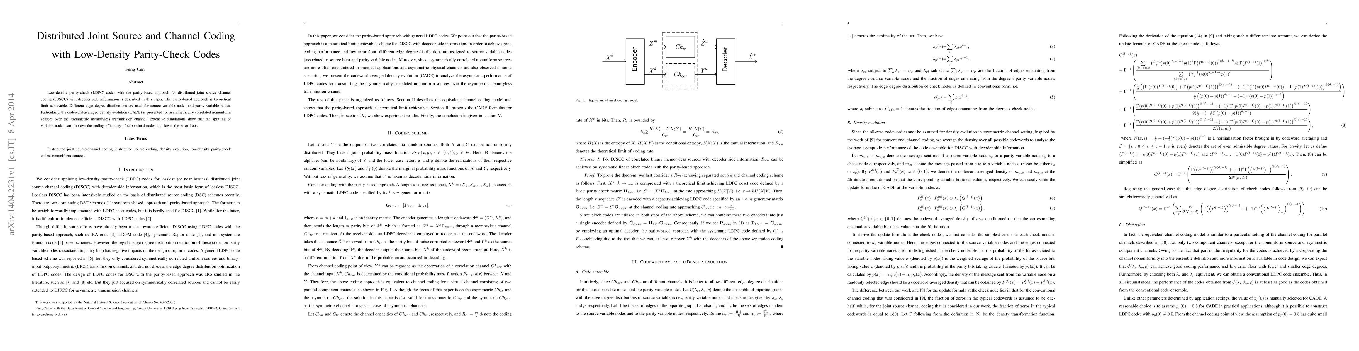 Low-density parity-check (LDPC) codes with the parity-based approach for distributed joint source channel coding (DJSCC) with decoder side information is described in this paper. The parity-based approach is theoretical limit achievable. Different edge degree distributions are used for source variable nodes and parity variable nodes. Particularly, the codeword-averaged density evolution (CADE) is presented for asymmetrically correlated nonuniform sources over the asymmetric memoryless transmission channel. Extensive simulations show that the splitting of variable nodes can improve the coding efficiency of suboptimal codes and lower the error floor.