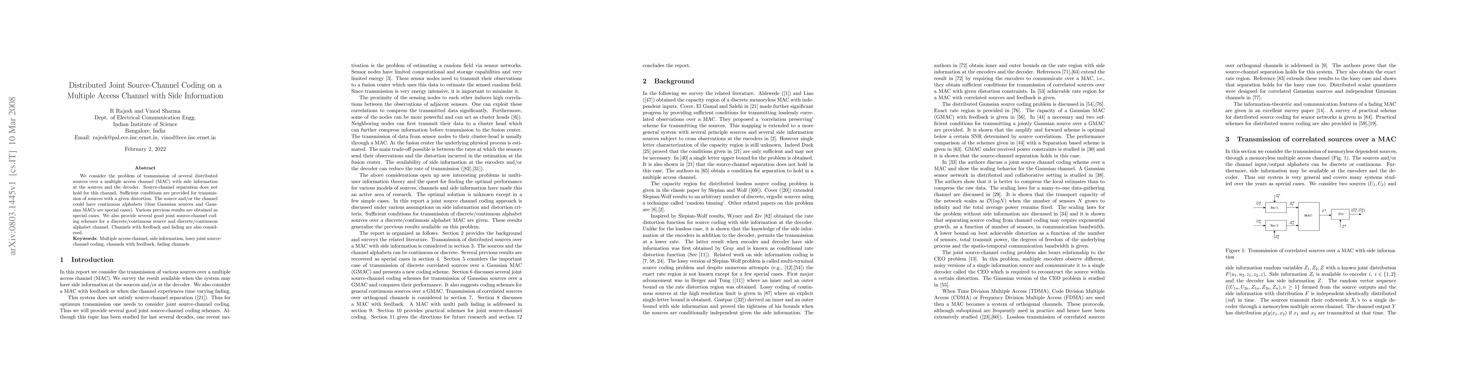 This paper explores distributed joint source-channel coding for multiple access channels with side information at both sources and the decoder. It provides sufficient conditions for achieving given distortion levels and presents various coding schemes for both discrete and continuous sources and channels, including those with feedback and fading.