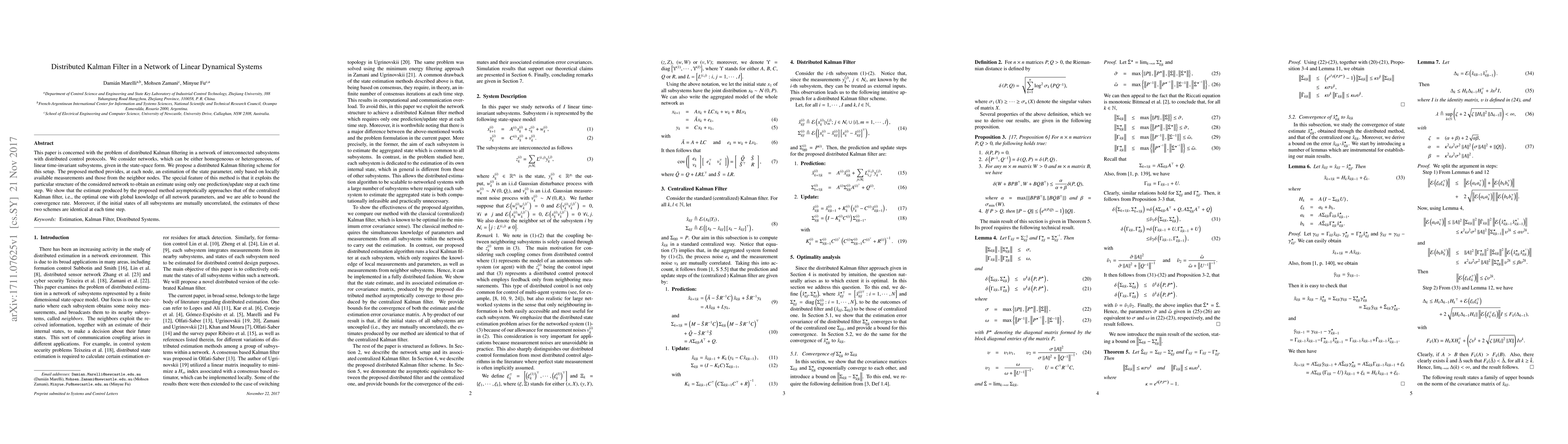 This paper proposes a distributed Kalman filtering scheme for networks of linear dynamical systems, enabling each node to estimate states using local and neighbor measurements. The method leverages network structure for efficient estimation, converging asymptotically to the centralized optimal filter.