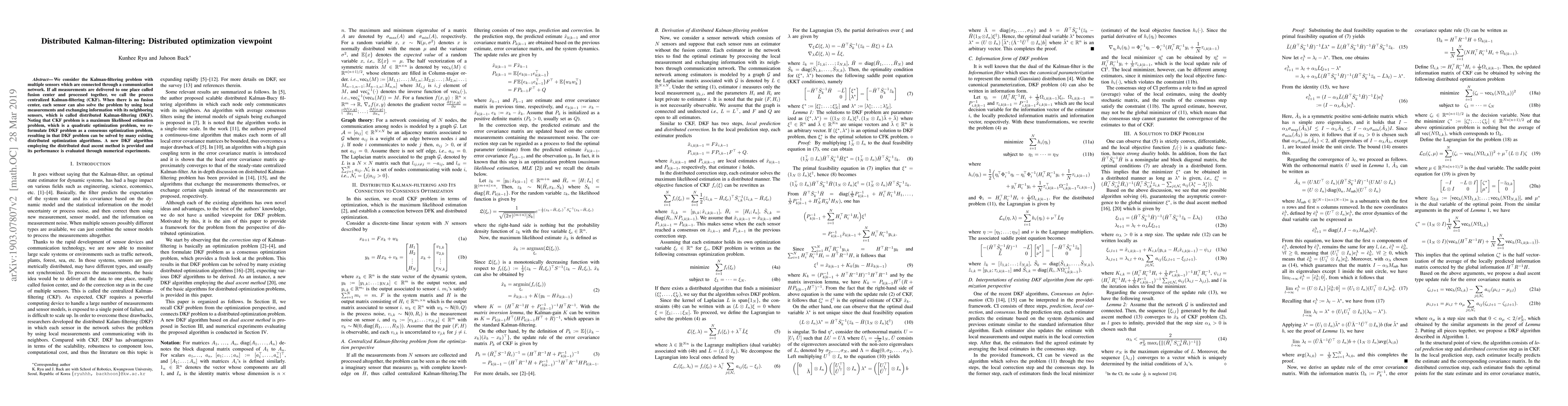 We consider the Kalman-filtering problem with multiple sensors which are connected through a communication network. If all measurements are delivered to one place called fusion center and processed together, we call the process centralized Kalman-filtering (CKF). When there is no fusion center, each sensor can also solve the problem by using local measurements and exchanging information with its neighboring sensors, which is called distributed Kalman-filtering (DKF). Noting that CKF problem is a maximum likelihood estimation problem, which is a quadratic optimization problem, we reformulate DKF problem as a consensus optimization problem, resulting in that DKF problem can be solved by many existing distributed optimization algorithms. A new DKF algorithm employing the distributed dual ascent method is provided and its performance is evaluated through numerical experiments.