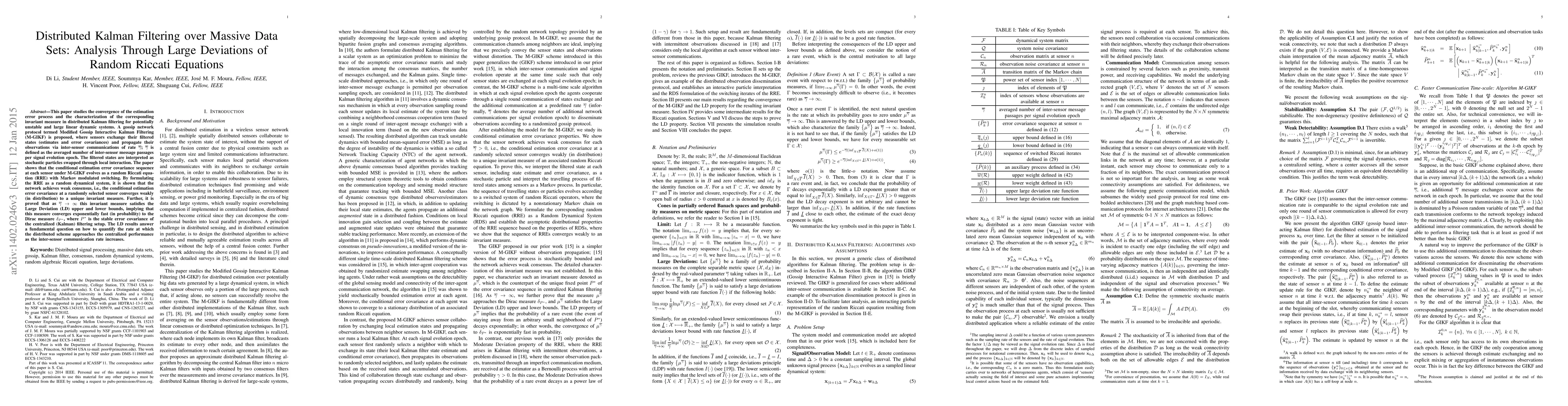 This paper studies the convergence of the estimation error process and the characterization of the corresponding invariant measure in distributed Kalman filtering for potentially unstable and large linear dynamic systems. A gossip network protocol termed Modified Gossip Interactive Kalman Filtering (M-GIKF) is proposed, where sensors exchange their filtered states (estimates and error covariances) and propagate their observations via inter-sensor communications of rate $\overline{\gamma}$; $\overline{\gamma}$ is defined as the averaged number of inter-sensor message passages per signal evolution epoch. The filtered states are interpreted as stochastic particles swapped through local interaction. The paper shows that the conditional estimation error covariance sequence at each sensor under M-GIKF evolves as a random Riccati equation (RRE) with Markov modulated switching. By formulating the RRE as a random dynamical system, it is shown that the network achieves weak consensus, i.e., the conditional estimation error covariance at a randomly selected sensor converges weakly (in distribution) to a unique invariant measure. Further, it is proved that as $\overline{\gamma} \rightarrow \infty$ this invariant measure satisfies the Large Deviation (LD) upper and lower bounds, implying that this measure converges exponentially fast (in probability) to the Dirac measure $\delta_{P^*}$, where $P^*$ is the stable error covariance of the centralized (Kalman) filtering setup. The LD results answer a fundamental question on how to quantify the rate at which the distributed scheme approaches the centralized performance as the inter-sensor communication rate increases.