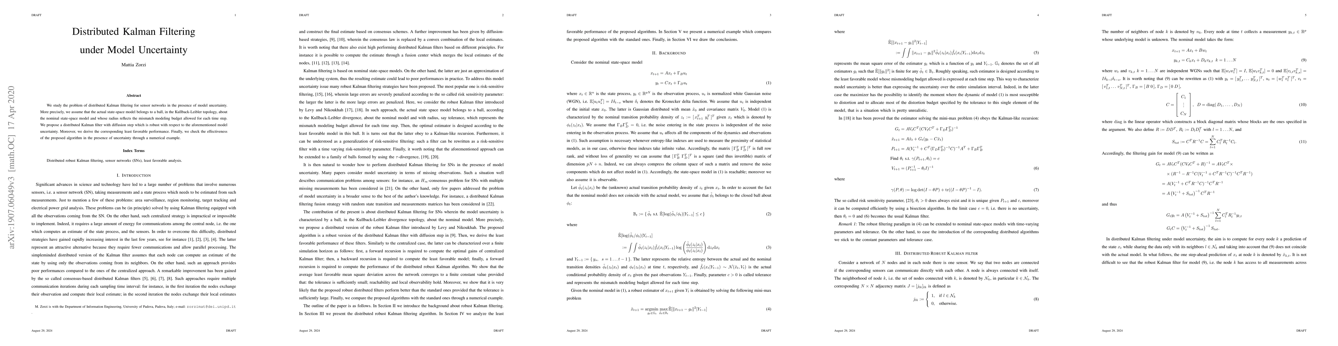 This paper proposes a distributed Kalman filter with a diffusion step for sensor networks that accounts for model uncertainty, deriving its robustness and least favorable performance. A numerical example is used to demonstrate the algorithm's effectiveness under model mismatch.