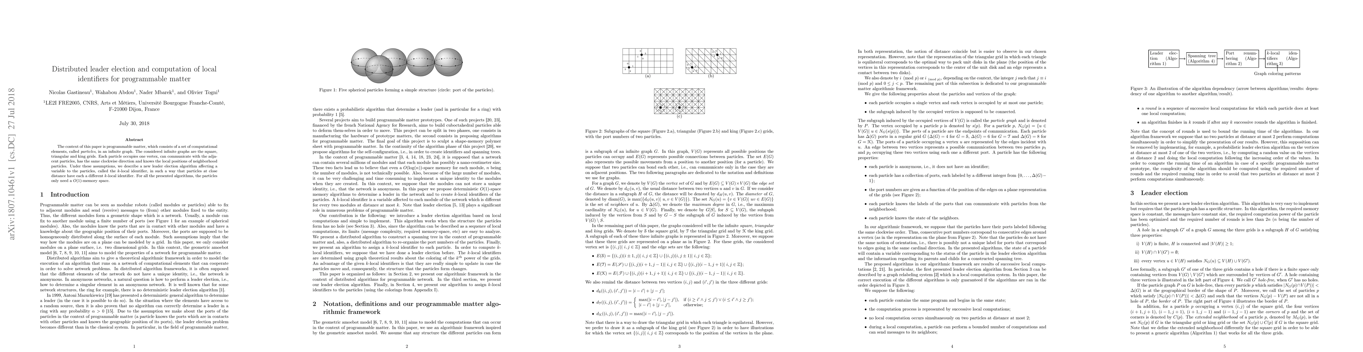 The context of this paper is programmable matter, which consists of a set of computational elements, called particles, in an infinite graph. The considered infinite graphs are the square, triangular and king grids. Each particle occupies one vertex, can communicate with the adjacent particles, has the same clockwise direction and knows the local positions of neighborhood particles. Under these assumptions, we describe a new leader election algorithm affecting a variable to the particles, called the k-local identifier, in such a way that particles at close distance have each a different k-local identifier. For all the presented algorithms, the particles only need a O(1)-memory space.
