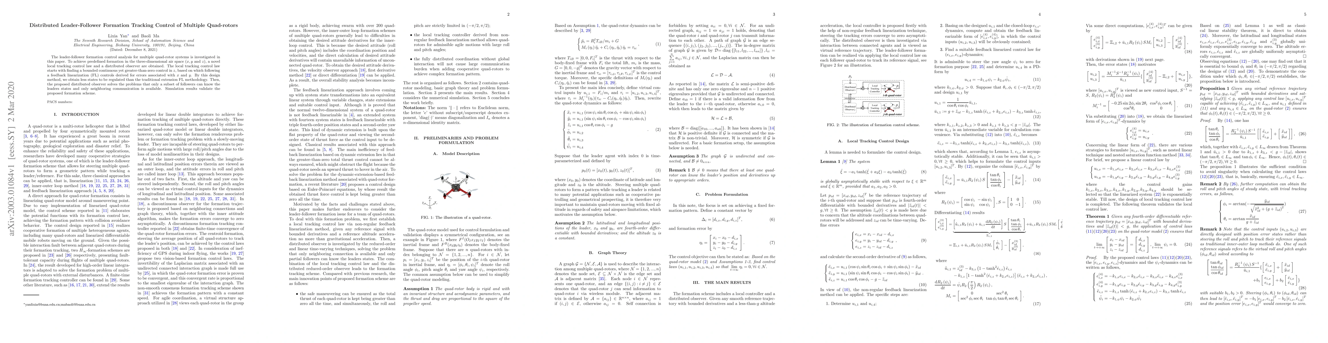 The paper presents a local tracking control law and a distributed observer for leader-follower formation tracking of multiple quad-rotors, ensuring stability and coordination without requiring global information.