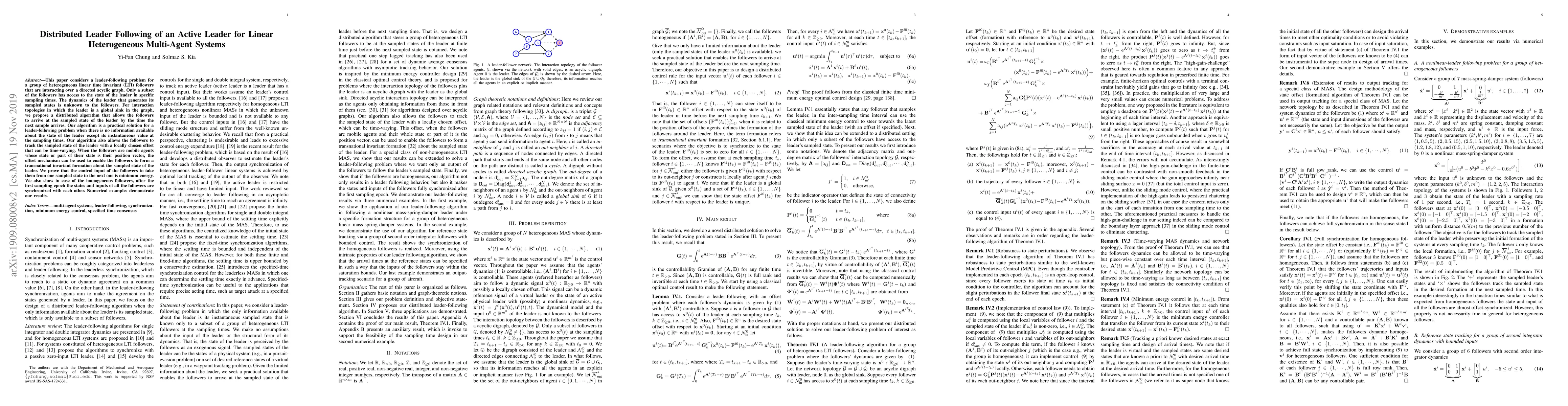 This paper considers a leader-following problem for a group of heterogeneous linear time invariant (LTI) followers that are interacting over a directed acyclic graph. Only a subset of the followers has access to the state of the leader in specific sampling times. The dynamics of the leader that generates its sampled states is unknown to the followers. For interaction topologies in which the leader is a global sink in the graph, we propose a distributed algorithm that allows the followers to arrive at the sampled state of the leader by the time the next sample arrives. Our algorithm is a practical solution for a leader-following problem when there is no information available about the state of the leader except its instantaneous value at the sampling times. Our algorithm also allows the followers to track the sampled state of the leader with a locally chosen offset that can be time-varying. When the followers are mobile agents whose state or part of their state is their position vector, the offset mechanism can be used to enable the followers to form a transnational invariant formation about the sampled state of the leader. We prove that the control input of the followers to take them from one sampled state to the next one is minimum energy. We also show in case of the homogeneous followers, after the first sampling epoch the states and inputs of all the followers are synchronized with each other. Numerical examples demonstrate our results.