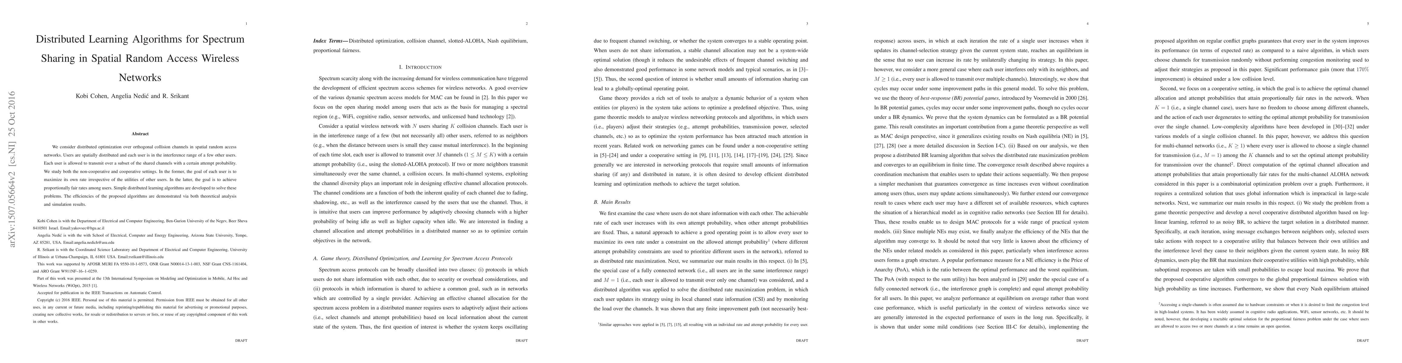 This paper proposes distributed learning algorithms for optimizing spectrum sharing in spatial random access wireless networks, focusing on both non-cooperative and cooperative settings. The algorithms aim to maximize individual user rates or achieve fair rates among users, with efficiency demonstrated through theoretical analysis and simulations.