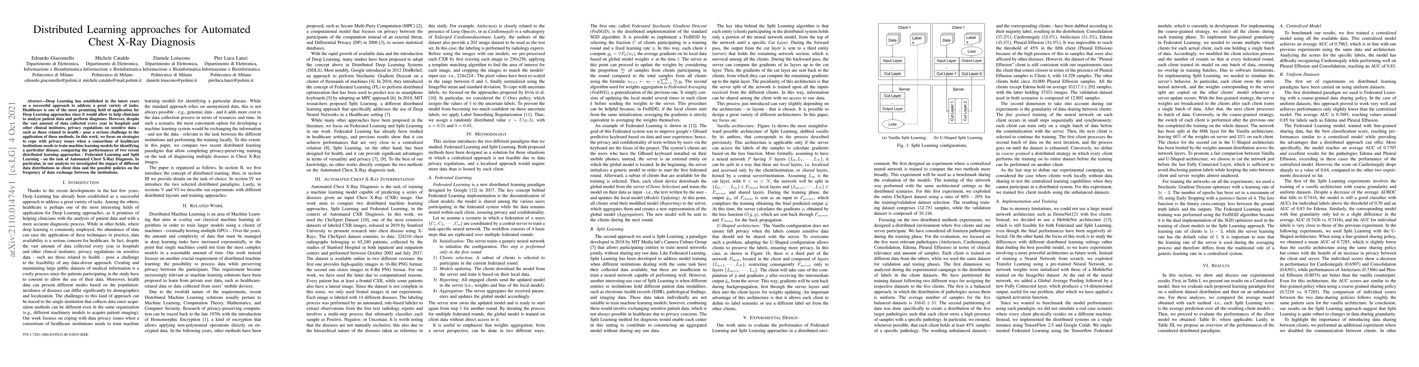This paper explores distributed learning approaches to automate chest X-ray diagnosis while addressing privacy concerns in healthcare institutions. It compares the performance of Federated Learning and Split Learning methods with varying data distributions and exchange policies.