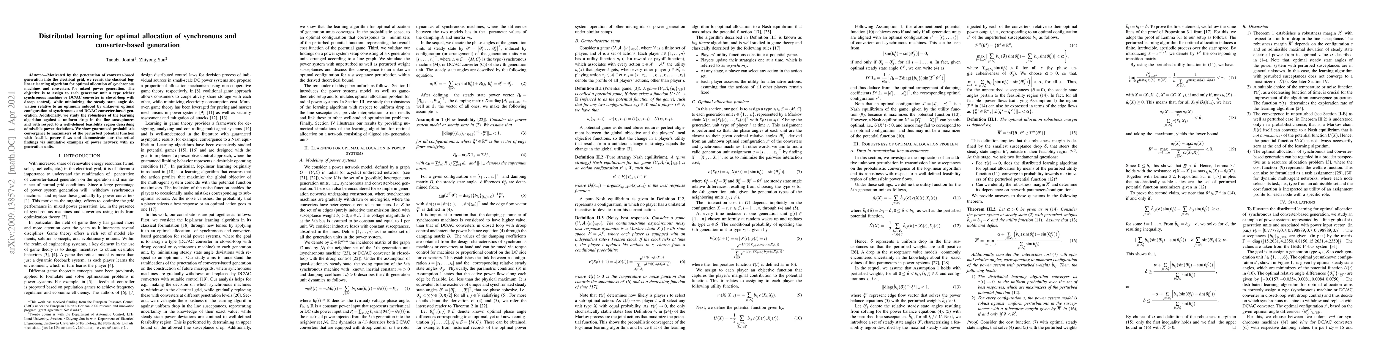 This paper proposes a distributed learning algorithm for optimally allocating synchronous machines and converter-based generation in power grids, aiming to minimize steady-state angle deviations. It also examines the robustness of the algorithm under line susceptance drops and within a feasible power deviation region, demonstrating theoretical convergence through simulations of a six-unit power network.