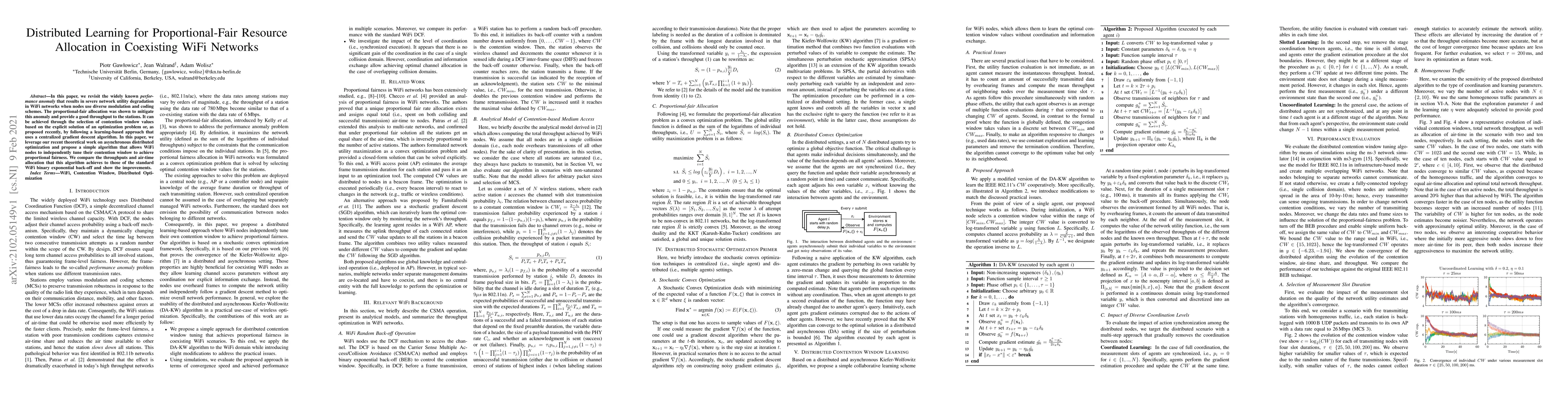 This paper proposes a distributed learning algorithm for WiFi networks to achieve proportional-fair resource allocation, mitigating performance anomalies caused by diverse modulation schemes. It demonstrates improved throughput compared to standard binary exponential back-off methods.