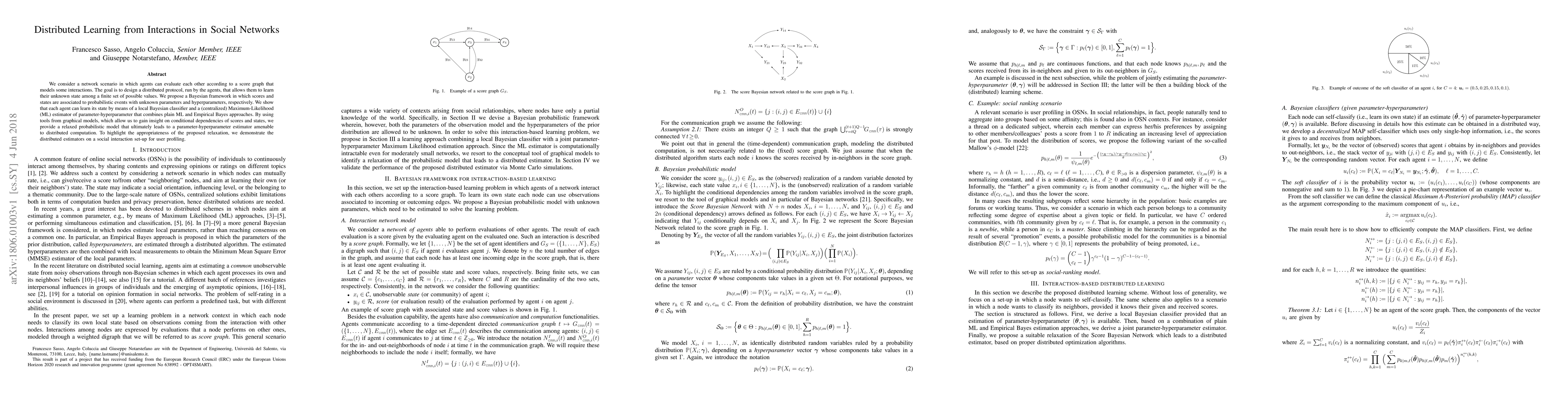 We consider a network scenario in which agents can evaluate each other according to a score graph that models some interactions. The goal is to design a distributed protocol, run by the agents, that allows them to learn their unknown state among a finite set of possible values. We propose a Bayesian framework in which scores and states are associated to probabilistic events with unknown parameters and hyperparameters, respectively. We show that each agent can learn its state by means of a local Bayesian classifier and a (centralized) Maximum-Likelihood (ML) estimator of parameter-hyperparameter that combines plain ML and Empirical Bayes approaches. By using tools from graphical models, which allow us to gain insight on conditional dependencies of scores and states, we provide a relaxed probabilistic model that ultimately leads to a parameter-hyperparameter estimator amenable to distributed computation. To highlight the appropriateness of the proposed relaxation, we demonstrate the distributed estimators on a social interaction set-up for user profiling.
