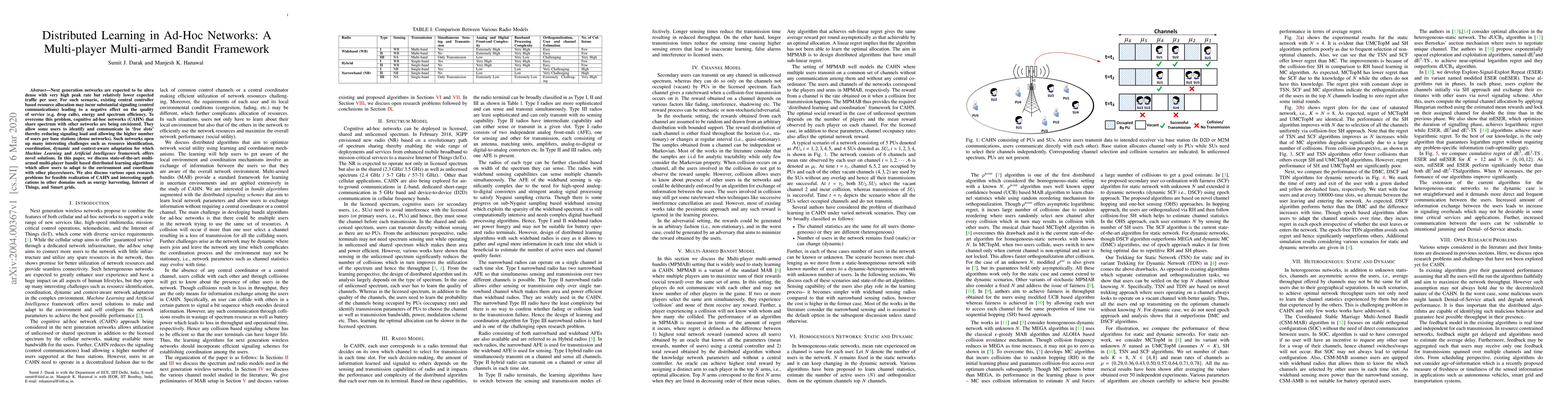 Next-generation networks are expected to be ultra-dense with a very high peak rate but relatively lower expected traffic per user. For such scenario, existing central controller based resource allocation may incur substantial signaling (control communications) leading to a negative effect on the quality of service (e.g. drop calls), energy and spectrum efficiency. To overcome this problem, cognitive ad-hoc networks (CAHN) that share spectrum with other networks are being envisioned. They allow some users to identify and communicate in `free slots' thereby reducing signaling load and allowing the higher number of users per base stations (dense networks). Such networks open up many interesting challenges such as resource identification, coordination, dynamic and context-aware adaptation for which Machine Learning and Artificial Intelligence framework offers novel solutions. In this paper, we discuss state-of-the-art multi-armed multi-player bandit based distributed learning algorithms that allow users to adapt to the environment and coordinate with other players/users. We also discuss various open research problems for feasible realization of CAHN and interesting applications in other domains such as energy harvesting, Internet of Things, and Smart grids.