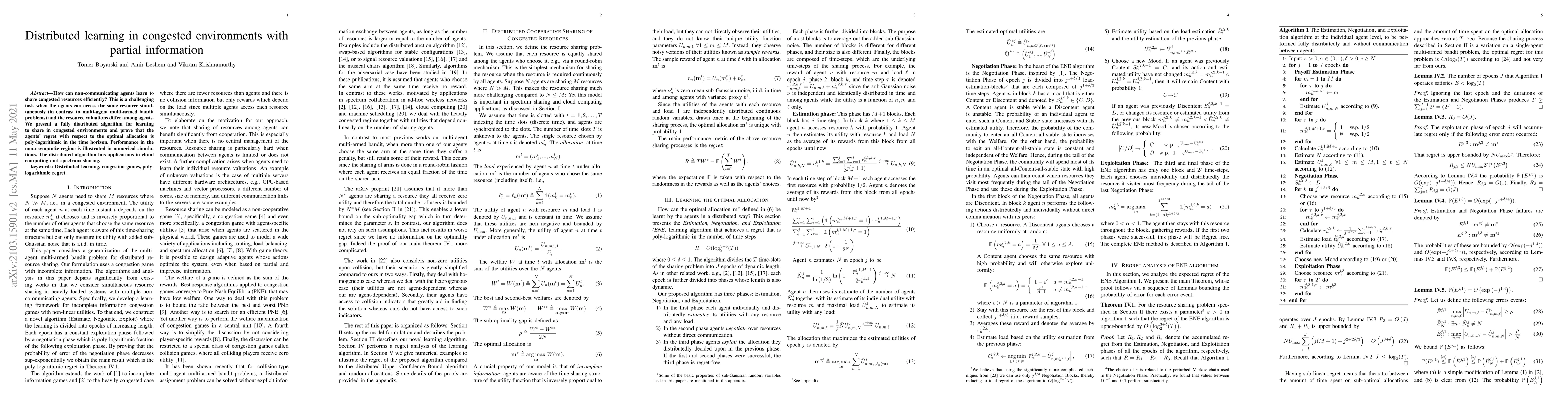This paper proposes a fully distributed algorithm for non-communicating agents to efficiently share congested resources, demonstrating poly-logarithmic regret in the time horizon. The algorithm's effectiveness is shown through numerical simulations and has applications in cloud computing and spectrum sharing.