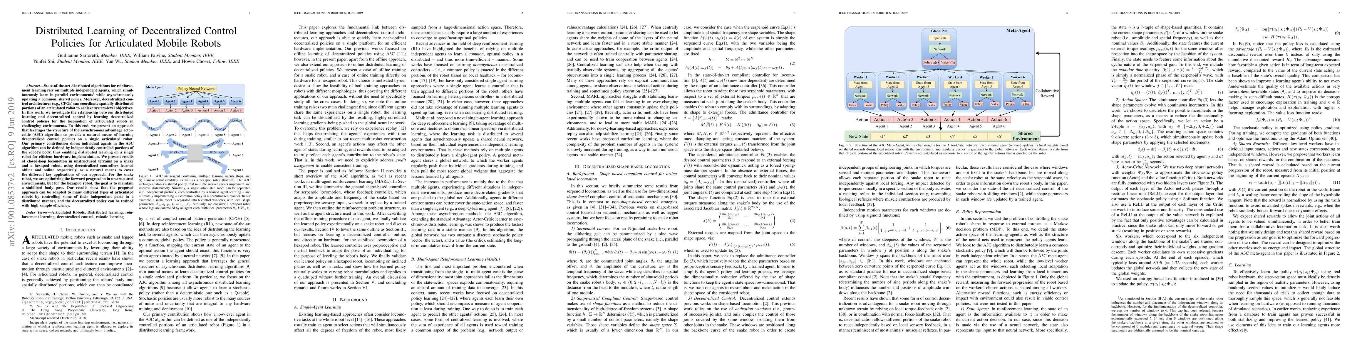 This paper explores distributed learning for decentralized control policies in articulated mobile robots, using an A3C-based approach to enable efficient hardware implementation. The study demonstrates successful locomotion in unstructured terrains using both offline and online learned decentralized controllers for snake and hexapod robots.