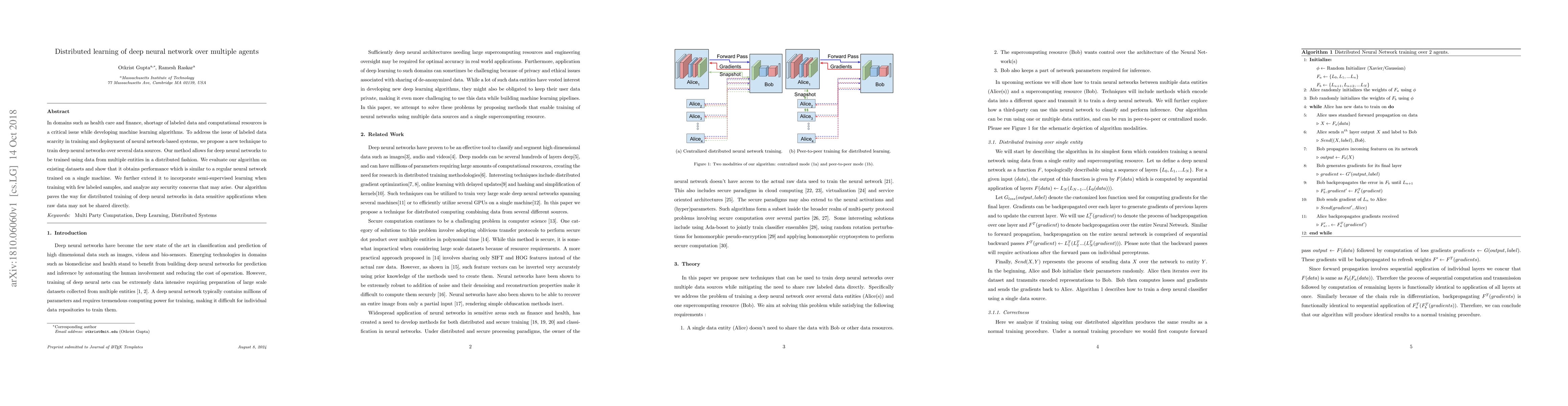 This paper proposes a distributed learning technique for training deep neural networks across multiple data sources, addressing data scarcity and computational resource limitations. The method achieves performance comparable to centralized training and incorporates semi-supervised learning for scenarios with few labeled samples, while also considering security implications.