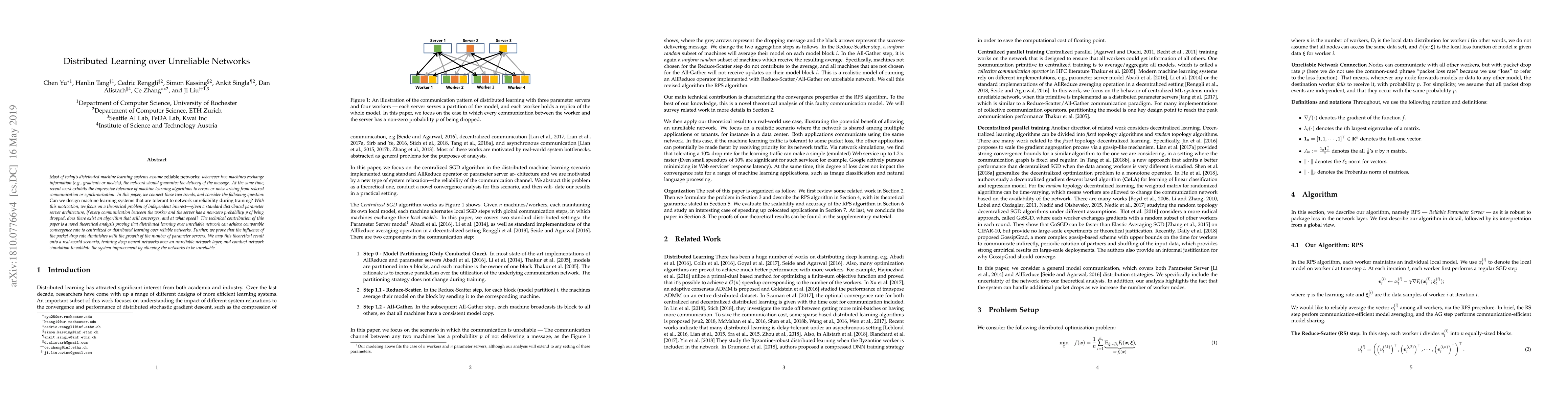Most of today's distributed machine learning systems assume {\em reliable networks}: whenever two machines exchange information (e.g., gradients or models), the network should guarantee the delivery of the message. At the same time, recent work exhibits the impressive tolerance of machine learning algorithms to errors or noise arising from relaxed communication or synchronization. In this paper, we connect these two trends, and consider the following question: {\em Can we design machine learning systems that are tolerant to network unreliability during training?} With this motivation, we focus on a theoretical problem of independent interest---given a standard distributed parameter server architecture, if every communication between the worker and the server has a non-zero probability $p$ of being dropped, does there exist an algorithm that still converges, and at what speed? The technical contribution of this paper is a novel theoretical analysis proving that distributed learning over unreliable network can achieve comparable convergence rate to centralized or distributed learning over reliable networks. Further, we prove that the influence of the packet drop rate diminishes with the growth of the number of \textcolor{black}{parameter servers}. We map this theoretical result onto a real-world scenario, training deep neural networks over an unreliable network layer, and conduct network simulation to validate the system improvement by allowing the networks to be unreliable.