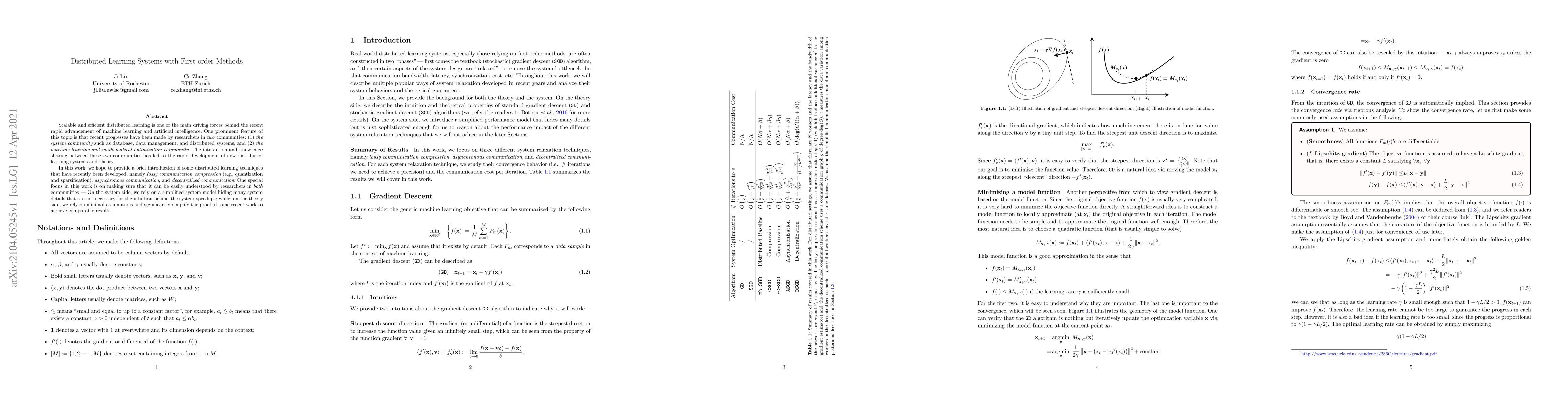 This paper introduces distributed learning systems using first-order methods, focusing on scalable techniques like lossy communication compression, asynchronous communication, and decentralized communication. It aims to bridge system and machine learning communities by simplifying system models and theoretical proofs.