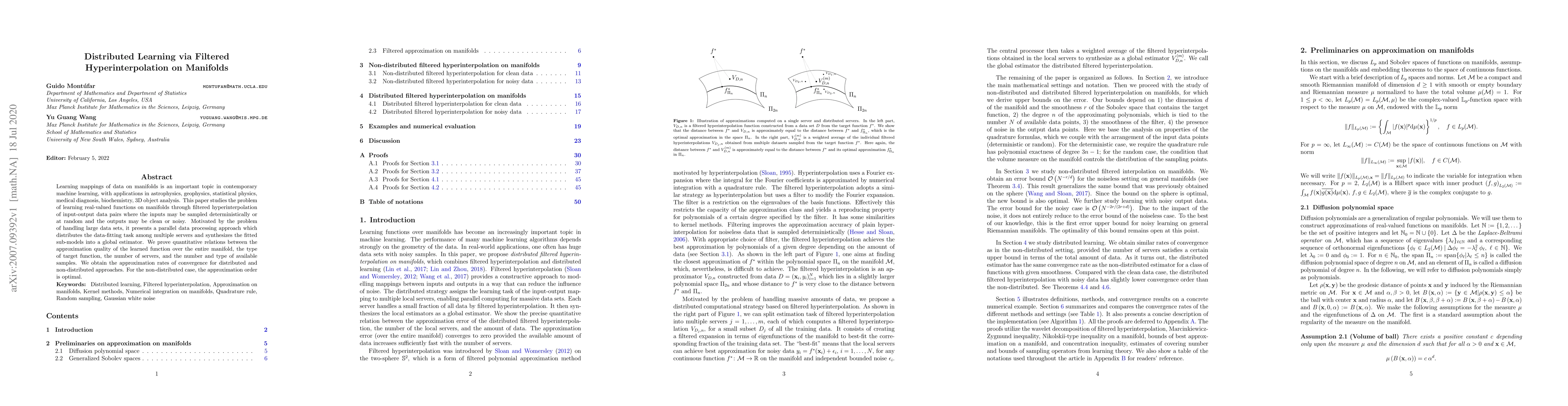 Learning mappings of data on manifolds is an important topic in contemporary machine learning, with applications in astrophysics, geophysics, statistical physics, medical diagnosis, biochemistry, 3D object analysis. This paper studies the problem of learning real-valued functions on manifolds through filtered hyperinterpolation of input-output data pairs where the inputs may be sampled deterministically or at random and the outputs may be clean or noisy. Motivated by the problem of handling large data sets, it presents a parallel data processing approach which distributes the data-fitting task among multiple servers and synthesizes the fitted sub-models into a global estimator. We prove quantitative relations between the approximation quality of the learned function over the entire manifold, the type of target function, the number of servers, and the number and type of available samples. We obtain the approximation rates of convergence for distributed and non-distributed approaches. For the non-distributed case, the approximation order is optimal.