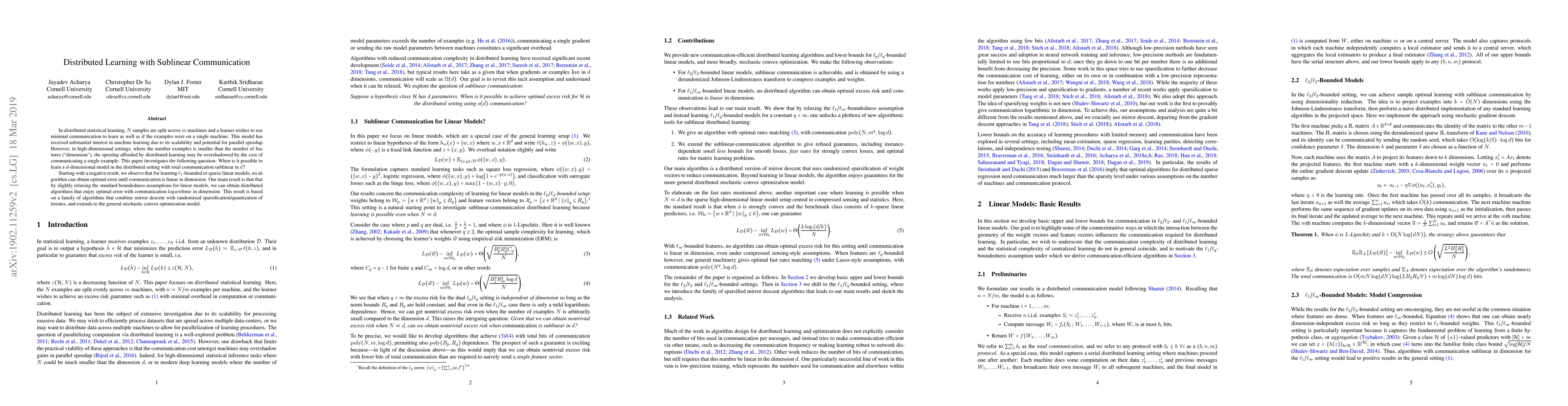 This paper explores distributed learning with minimal communication, demonstrating that while communication costs can limit scalability in high-dimensional settings, optimal error can still be achieved with logarithmic communication complexity by relaxing standard boundedness assumptions for linear models. The proposed algorithms combine mirror descent with randomized sparsification.