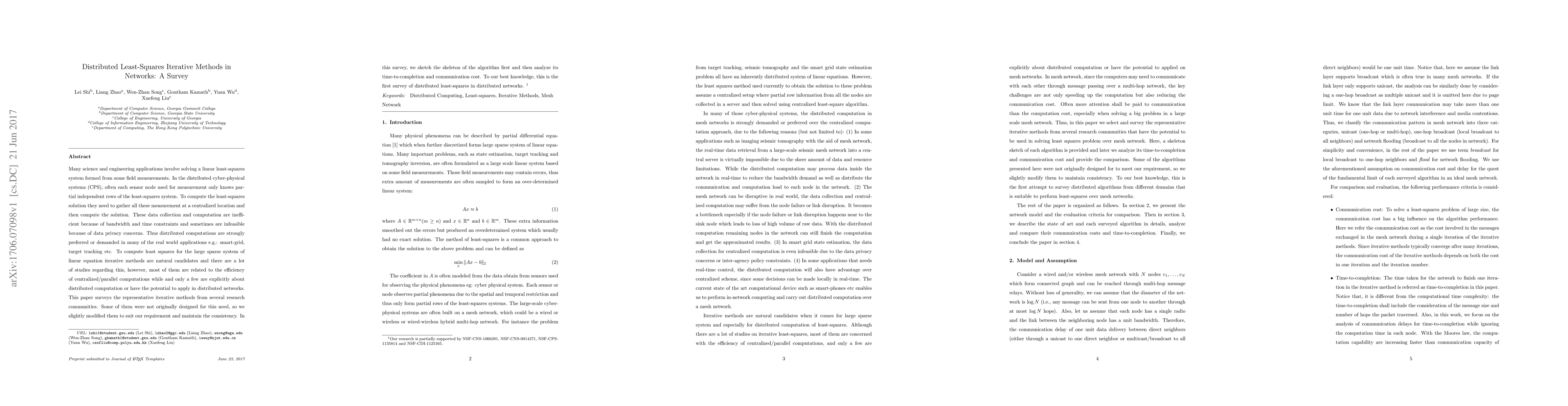 Many science and engineering applications involve solving a linear least-squares system formed from some field measurements. In the distributed cyber-physical systems (CPS), often each sensor node used for measurement only knows partial independent rows of the least-squares system. To compute the least-squares solution they need to gather all these measurement at a centralized location and then compute the solution. These data collection and computation are inefficient because of bandwidth and time constraints and sometimes are infeasible because of data privacy concerns. Thus distributed computations are strongly preferred or demanded in many of the real world applications e.g.: smart-grid, target tracking etc. To compute least squares for the large sparse system of linear equation iterative methods are natural candidates and there are a lot of studies regarding this, however, most of them are related to the efficiency of centralized/parallel computations while and only a few are explicitly about distributed computation or have the potential to apply in distributed networks. This paper surveys the representative iterative methods from several research communities. Some of them were not originally designed for this need, so we slightly modified them to suit our requirement and maintain the consistency. In this survey, we sketch the skeleton of the algorithm first and then analyze its time-to-completion and communication cost. To our best knowledge, this is the first survey of distributed least-squares in distributed networks.