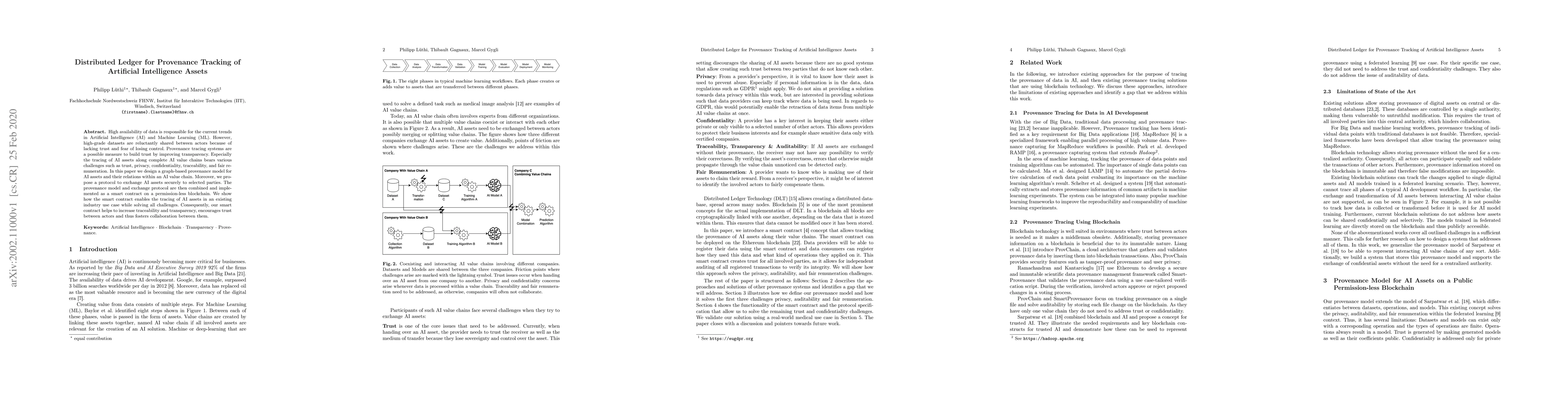 High availability of data is responsible for the current trends in Artificial Intelligence (AI) and Machine Learning (ML). However, high-grade datasets are reluctantly shared between actors because of lacking trust and fear of losing control. Provenance tracing systems are a possible measure to build trust by improving transparency. Especially the tracing of AI assets along complete AI value chains bears various challenges such as trust, privacy, confidentiality, traceability, and fair remuneration. In this paper we design a graph-based provenance model for AI assets and their relations within an AI value chain. Moreover, we propose a protocol to exchange AI assets securely to selected parties. The provenance model and exchange protocol are then combined and implemented as a smart contract on a permission-less blockchain. We show how the smart contract enables the tracing of AI assets in an existing industry use case while solving all challenges. Consequently, our smart contract helps to increase traceability and transparency, encourages trust between actors and thus fosters collaboration between them.