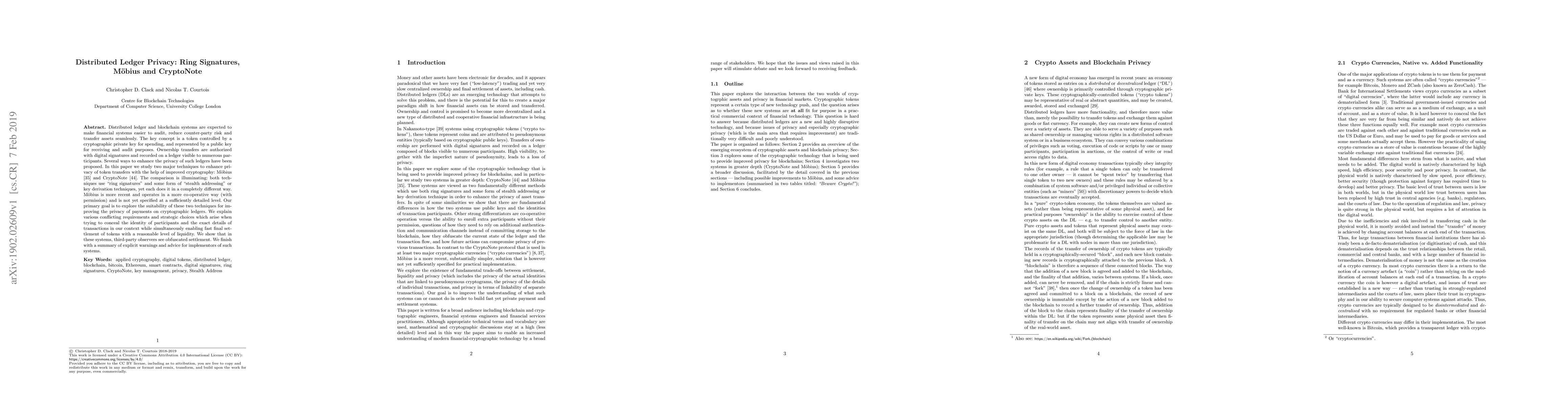 Distributed ledger and blockchain systems are expected to make financial systems easier to audit, reduce counter-party risk and transfer assets seamlessly. The key concept is a token controlled by a cryptographic private key for spending, and represented by a public key for receiving and audit purposes. Ownership transfers are authorized with digital signatures and recorded on a ledger visible to numerous participants. Several ways to enhance the privacy of such ledgers have been proposed. In this paper we study two major techniques to enhance privacy of token transfers with the help of improved cryptography: M\"obius and CryptoNote. The comparison is illuminating: both techniques use "ring signatures" and some form of "stealth addressing" or key derivation techniques, yet each does it in a completely different way. M\"obius is more recent and operates in a more co-operative way (with permission) and is not yet specified at a sufficiently detailed level. Our primary goal is to explore the suitability of these two techniques for improving the privacy of payments on cryptographic ledgers. We explain various conflicting requirements and strategic choices which arise when trying to conceal the identity of participants and the exact details of transactions in our context while simultaneously enabling fast final settlement of tokens with a reasonable level of liquidity. We show that in these systems, third-party observers see obfuscated settlement. We finish with a summary of explicit warnings and advice for implementors of such systems.