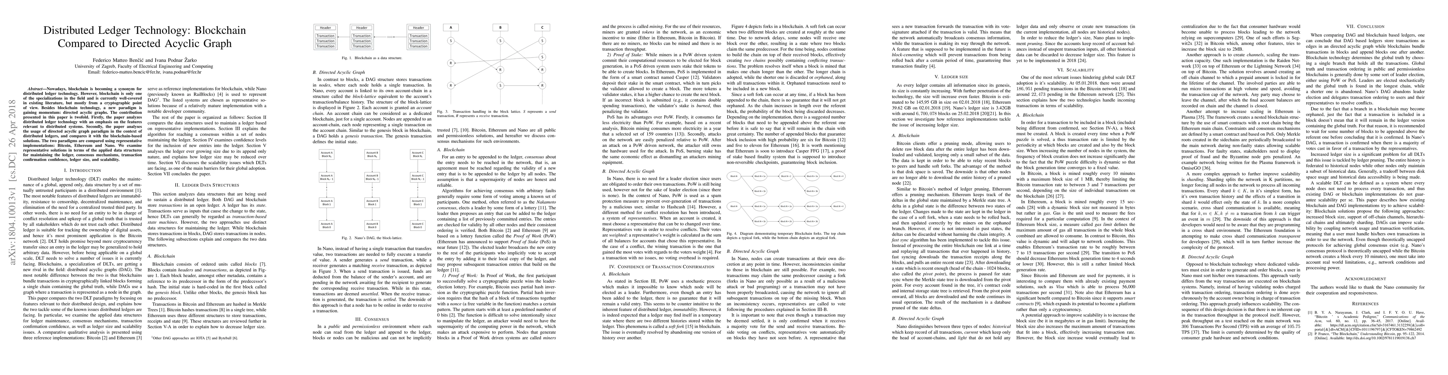 This paper compares blockchain and directed acyclic graphs (DAG) in the context of distributed ledger technology, focusing on features relevant to distributed systems. It evaluates representative implementations like Bitcoin, Ethereum, and Nano based on data structures, consensus mechanisms, transaction confirmation confidence, ledger size, and scalability.