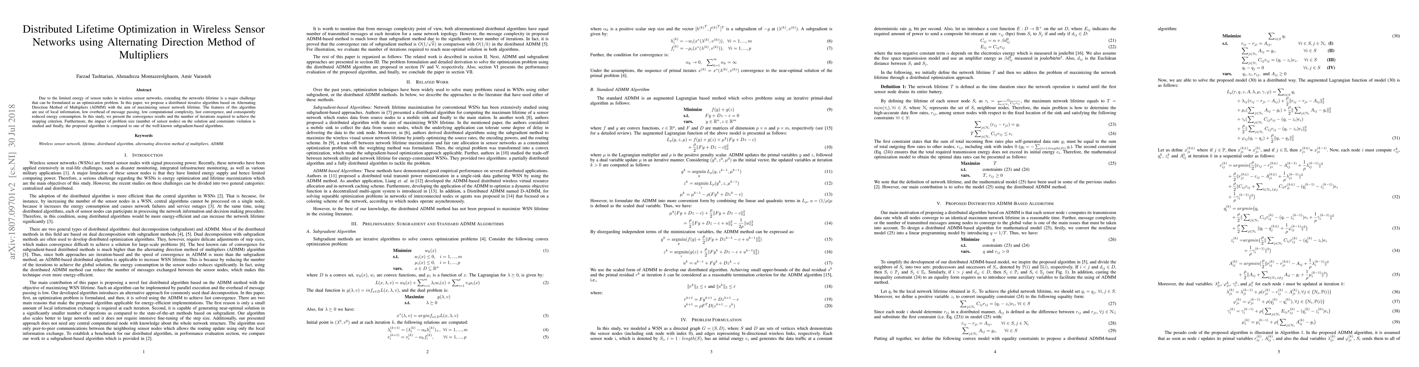 This paper proposes a distributed optimization algorithm using the Alternating Direction Method of Multipliers (ADMM) to maximize the lifetime of wireless sensor networks by minimizing energy consumption. The algorithm leverages local information, has low overhead, and demonstrates fast convergence, while a comparative study against a subgradient-based method is presented.