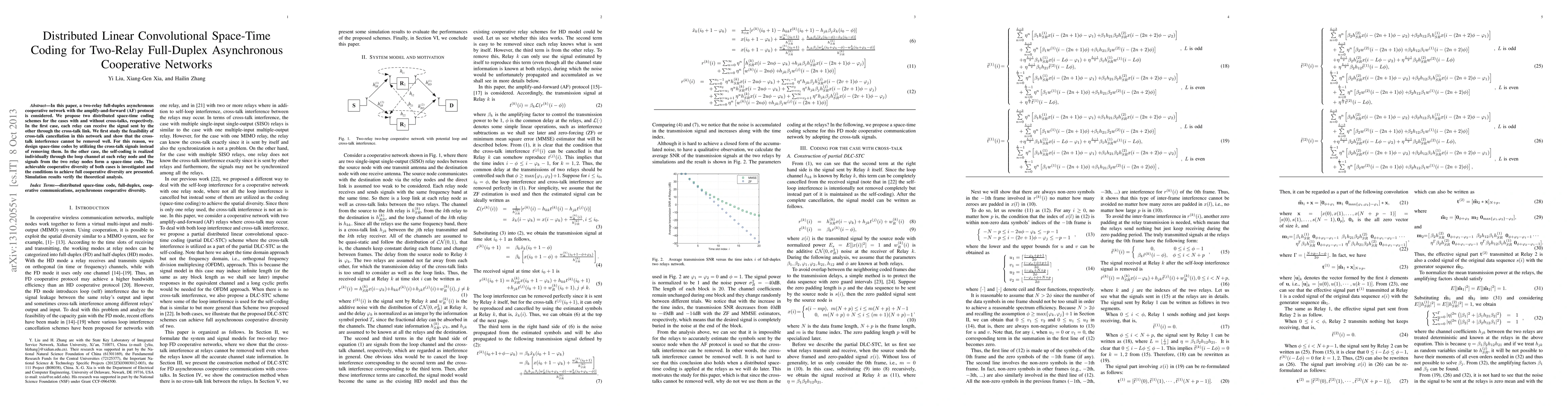 This paper proposes two distributed space-time coding schemes for a two-relay full-duplex asynchronous cooperative network. It explores the use of cross-talk signals instead of attempting to remove them, and investigates achievable cooperative diversity, presenting conditions for full cooperative diversity. Simulation results confirm the theoretical analysis.