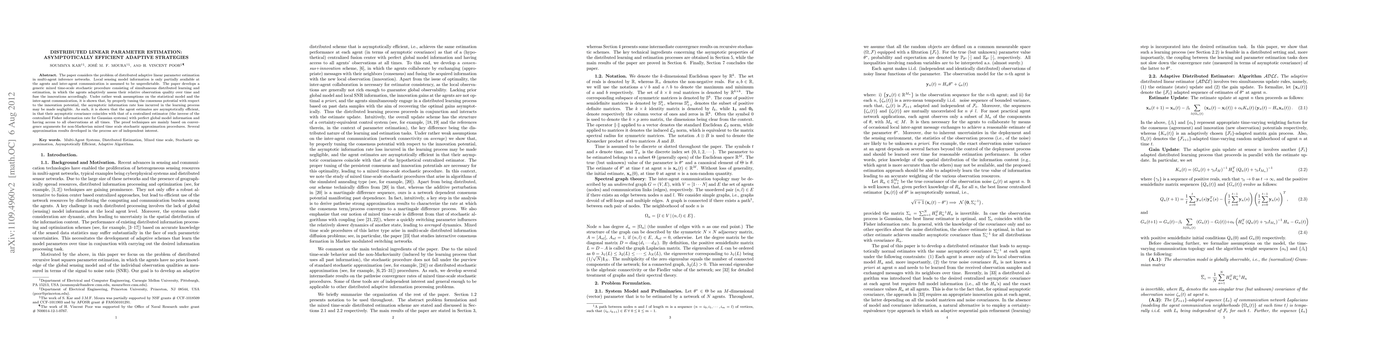 This paper develops adaptive strategies for distributed linear parameter estimation in multi-agent networks, showing that under weak assumptions, the agents' estimates can achieve asymptotic efficiency similar to a centralized estimator. The approach leverages mixed time-scale stochastic procedures to adaptively fuse innovations and minimize information rate loss.