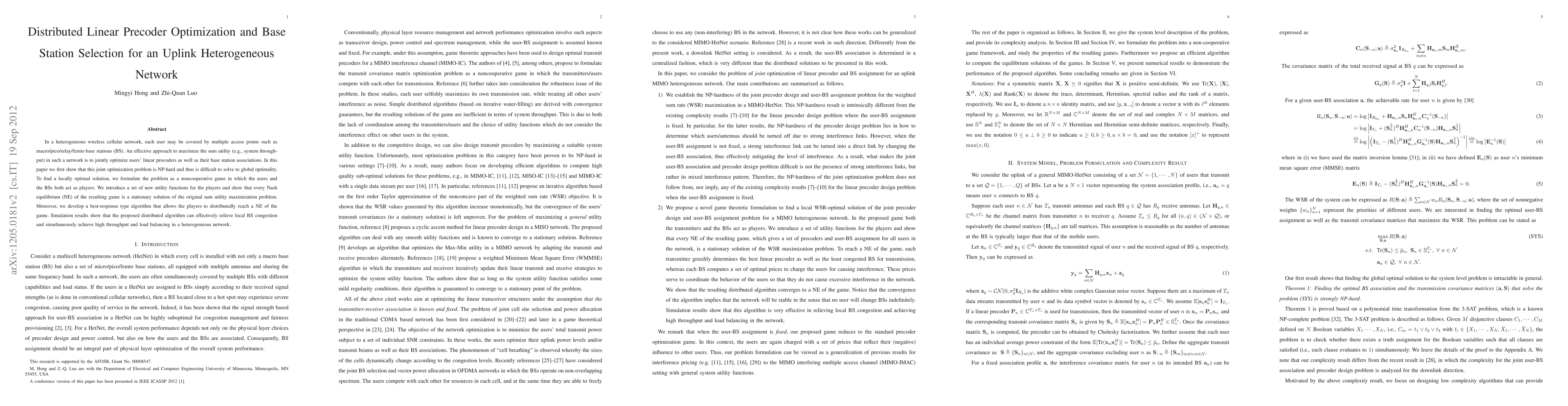 This paper addresses the NP-hard problem of jointly optimizing linear precoders and base station selection in an uplink heterogeneous network to maximize system throughput. It formulates the problem as a noncooperative game and proposes a distributed algorithm to reach a Nash equilibrium, achieving high throughput and load balancing while alleviating local base station congestion.