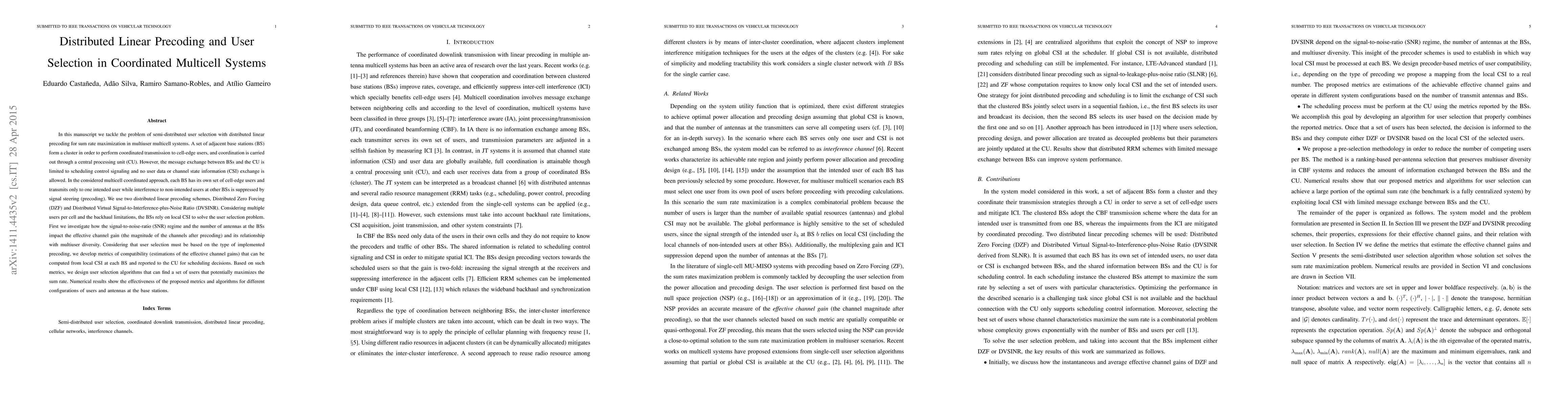 This paper addresses semi-distributed user selection and distributed linear precoding for sum rate maximization in multicell coordinated systems. The study proposes metrics based on local CSI to guide user selection, enabling effective interference suppression while adhering to limited backhaul communication.